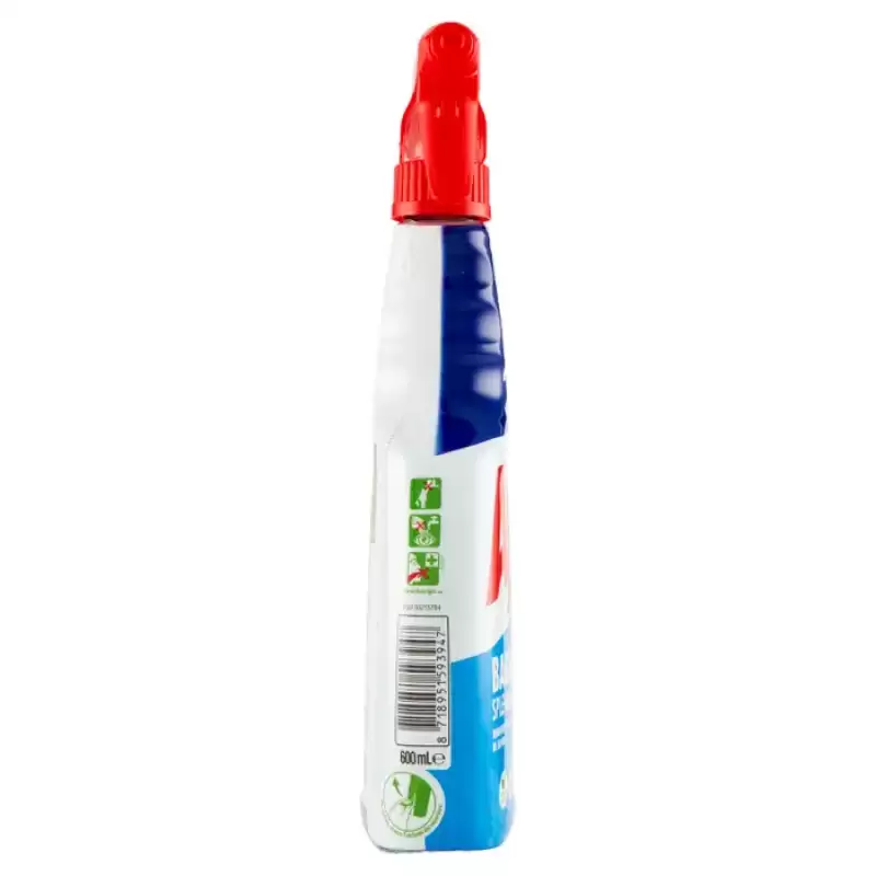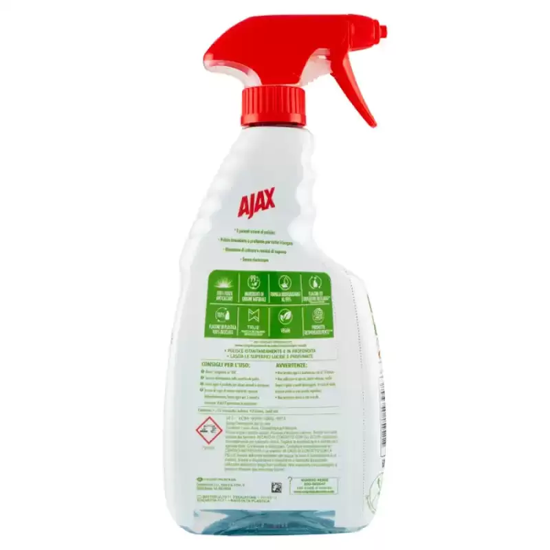 DESCRIERE: detergent spray baie lucios Ajax 600 ml Eliminați bătăile de cap de a vă curăța baia când utilizați detergent spray Ajax Bagno Splendente. Acest spray de curățat pentru baie a fost creat cu o putere de curățare care îndepărtează cu ușurință 100% depunerile de calcar, petele de apă și reziduurile de săpun. Pe lângă faptul că vă face baia să strălucească, acest produs de curățare a fost formulat și având în vedere mediul înconjurător. Are 99% ingrediente de origine naturală și formula sa este 99% biodegradabilă. În plus, acest produs de curățat pentru baie este vegan* și realizat în mod responsabil**, plus că vine într-o sticlă de plastic 100% reciclată pe care o poți recicla din nou, inclusiv dozatorul, după îndepărtarea etichetei. Lasă suprafețele băii tale strălucitoare, curate, strălucitoare și cu miros de proaspăt, cu un singur spray. *Fără ingrediente de origine animală **Pentru mai multe informații www.colgatepalmolive.com/responsibly-made INFORMATII PRODUS: SFATURI DE UTILIZARE: 1. Rotiti dozatorul pe „ON” 2. Pulverizati direct pe suprafetele de curatat 3. Lasati produsul sa actioneze cateva secunde si clatiti. 4. În caz de grăsime încăpățânată, pulverizați generos, lăsați timp de 5 minute și clătiți. Repetați operațiunea dacă este necesar. COMPOZIȚIE: Conține: <5% surfactanți amfoteri. Parfum, acid lactic.