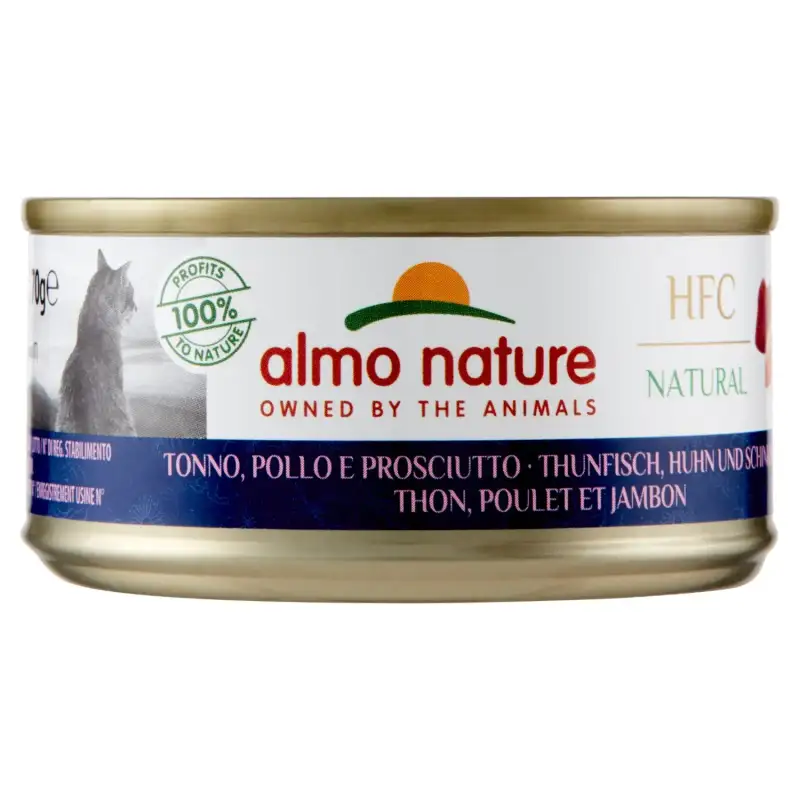 Hrană pentru pisici HFC Ton natural pui și șuncă 70g HFC: cu ingrediente inițial potrivite pentru consumul uman, acum hrană pentru pisici pentru alegere comercială.