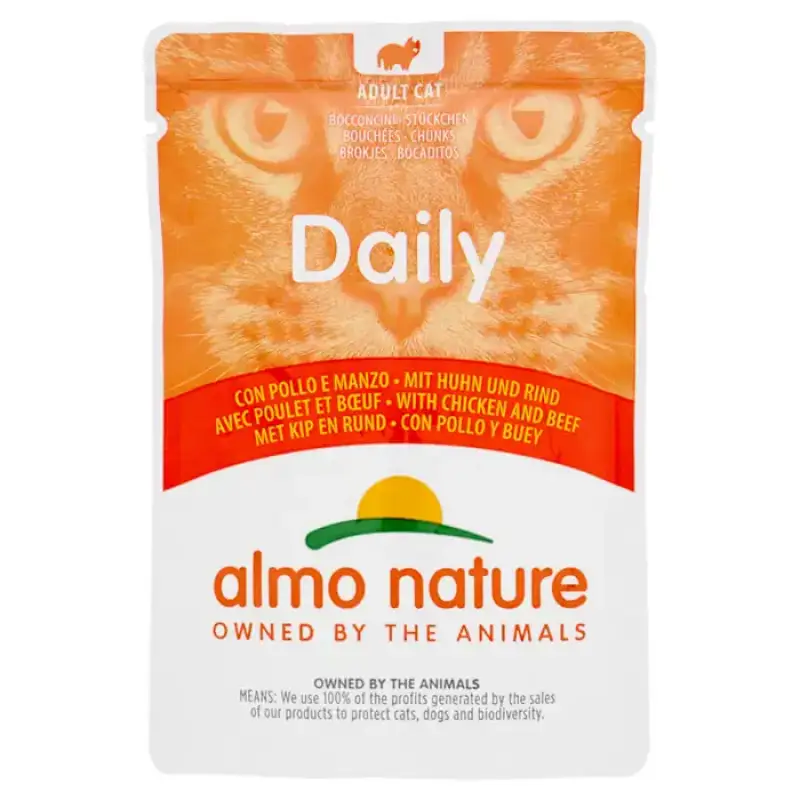 DESCRIERE: Mușcături de pisică Almo Nature cu Pui și Vită 70g INFORMATII PRODUS: 808 Kcal/kg Ratie zilnica aproximativa 24 H | Greutatea pisicii: 4 kg | Mâncare umedă 140g + Mâncare uscată 35g COMPOZIȚIE: Compoziție:, Carne și derivate (pui 4%, vită 4%), Subproduse de origine vegetală, Extracte de proteine ​​vegetale, Legume, Substanțe minerale.