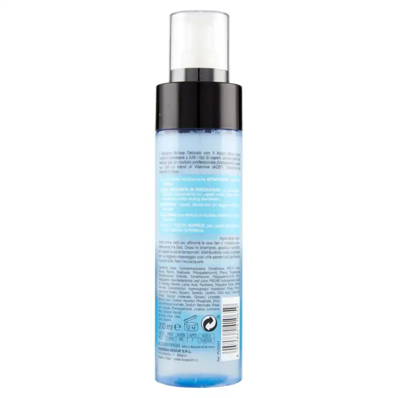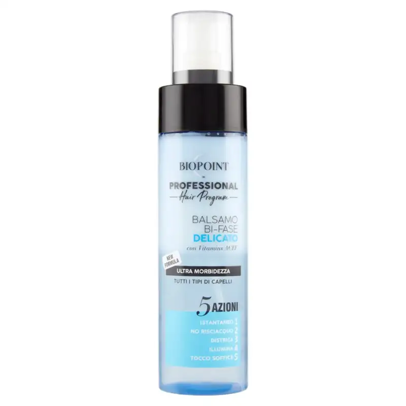 Balsamul Bifazic Delicat cu 5 Acțiuni oferă o nouă vitalitate și bunăstare tuturor tipurilor de păr, chiar și celor mai delicate, pentru un rezultat profesional direct la tine acasă. Cu un amestec de Vitamine (ACEF), Keratină și Extract de Aloe: 1 Are un efect de condiționare instantaneu asupra fibrei părului. 2 Nu necesită clătire, dar poate fi folosit direct pe părul umed înainte de uscare sau coafare după dorință. 3 Descurcă părul, lăsându-l mai ușor și mai ușor de pieptănat. 4 Iluminează și oferă un rezultat strălucitor pe toate lungimile. 5 Oferă o atingere moale, pentru părul care își recapătă moliciunea naturală.