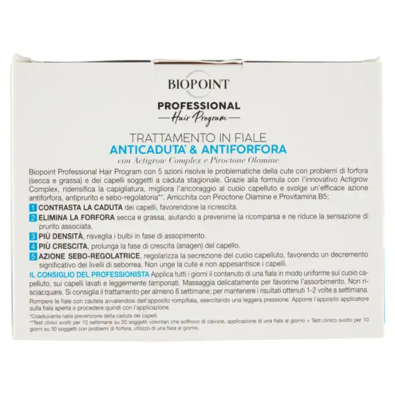 Programul Biopoint Professional Hair cu 5 acțiuni rezolvă problemele pielii cu mătreață (uscat și gras) și părul supus căderii sezoniere a părului. Datorită formulei cu complexul inovator Actigrow, redensifică părul, îmbunătățește ancorarea la nivelul scalpului și are o acțiune eficientă anti-mătreață, anti-mâncărime și de reglare a sebumului**. Îmbogățit cu Piroctone Olamină și Provitamina B5: 1, combate căderea părului, favorizând creșterea părului. 2 elimină mătreața uscată și grasă, ajutând la prevenirea reapariției acesteia și reducând senzația de mâncărime asociată. Cu 3 mai multe densitate, trezește becurile latente. 4 mai multă creștere, prelungește faza de creștere (anagen) a părului. 5 actiune sebumo-reglatoare, regleaza secretia scalpului, favorizand o scadere semnificativa a nivelului de seboree. Nu unge pielea și nu îngreunează părul. *Adjuvant in prevenirea caderii parului. **Teste clinice efectuate timp de 12 saptamani pe 20 de voluntari care sufera de chelie, aplicare a unei fiole pe zi + Test clinic efectuat timp de 10 zile pe 30 de subiecti cu probleme de matreata, folosire a unei fiole pe zi.