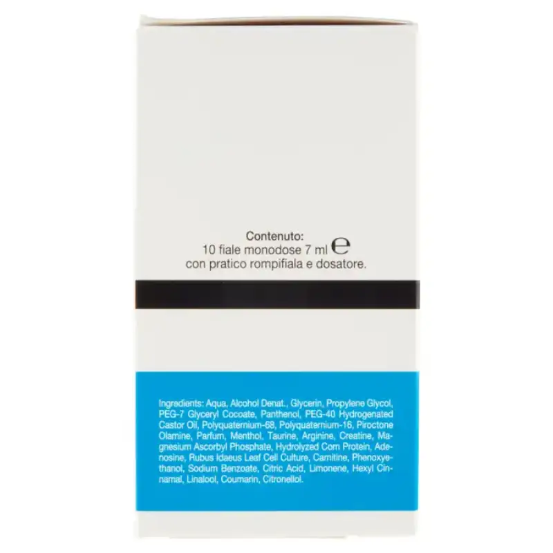 COMPOZIȚIE: Aqua, Alcool Denat., Glicerină, Propilen Glicol, PEG-7 Gliceril Cocoat, Pantenol, Ulei de Ricin Hidrogenat PEG-40, Polyquaternium-68, Polyquaternium-16, Piroctone Olamină, Parfum, Mentol, Taurină, Arginină, Creatină Fosfat de ascorbil, proteină de porumb hidrolizată, adenozină, cultură celulară a frunzelor de Rubus Idaeus, carnitină, fenoxietanol, benzoat de sodiu, acid citric, limonen, cinamal hexil, linalol, cumarină, citronellol.