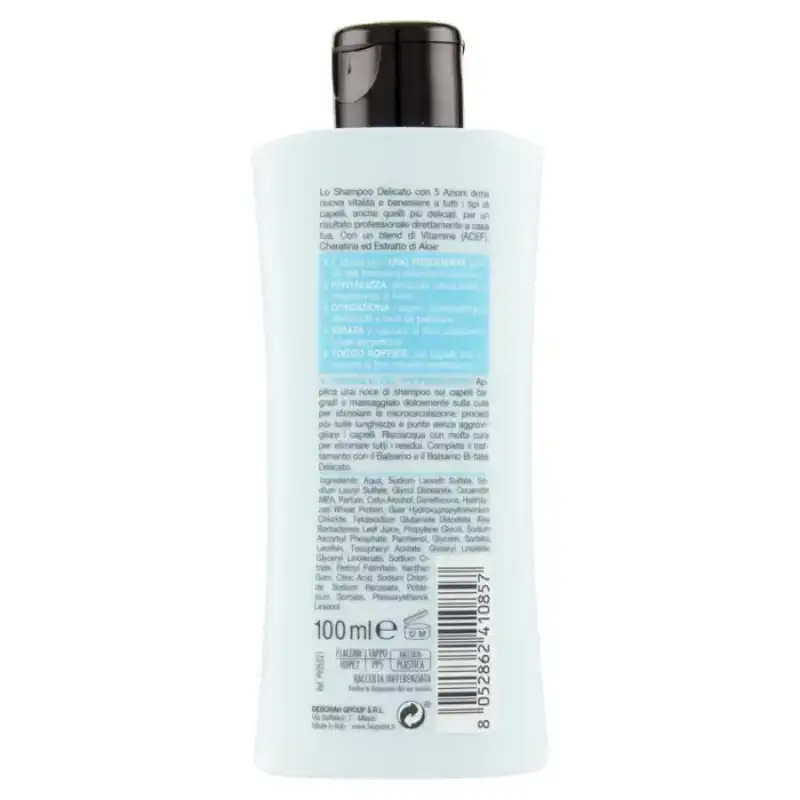 Șamponul delicat cu 5 acțiuni oferă o nouă vitalitate și stare de bine tuturor tipurilor de păr, chiar și celor mai delicate, pentru un rezultat profesional direct acasă. Cu un amestec de Vitamine (ACEF), Keratină și Extract de Aloe: 1 Este ideal pentru utilizare frecventă datorită formulei delicate de curățare. 2 Revitalizeaza, oferind noua putere si consistenta tulpinii. 3 Condiționează părul, lăsându-l mai detașabil și mai ușor de pieptănat. 4 Hidratează și regenerează fibra capilară în totală lejeritate. 5 La atingere moale, pentru părul care își recapătă moliciunea naturală.