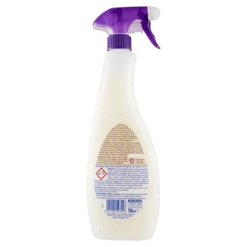 DESCRIERE: Chanteclair Degresant universal cu parfum de lavanda 700 ml. Degresant universal super puternic. Degresează, pătează și curăță temeinic toate tipurile de murdărie, chiar și cele mai încăpățânate, de pe toate suprafețele. Ideal chiar și pe țesături. Spray-ul special care funcționează și cu capul în jos vă permite să ajungeți în cele mai ascunse puncte și să folosiți până la ultima picătură de produs. Îl folosești la orice, funcționează peste tot. Curățător de suprafețe dure. PERICOL. Provoacă iritarea pielii. Provoacă leziuni oculare grave. A nu se lăsa la îndemâna copiilor. Purtați mănuși de protecție și protejați-vă ochii și fața. În caz de contact cu pielea: Spălați bine cu apă și săpun. În caz de contact cu ochii: Clătiți cu atenție timp de câteva minute. Îndepărtați orice lentile de contact dacă este ușor să faceți acest lucru. Continuați clătirea. Sunați imediat un centru de toxicologie sau un medic/medic. Dacă este nevoie de sfaturi medicale, aveți la îndemână recipientul sau eticheta produsului. Contine: izopropanolamine; Alcool etoxilat; Clorura de alchilmetilamină C12-C14 etoxilată cuaternizat. INFORMATII PRODUS: Avertisment: produs extrem de puternic. Pentru utilizare pe suprafețe noi sau delicate, verificați întotdeauna să nu existe probleme de decolorare sau inadecvare a produsului pentru utilizarea prevăzută, testând mai întâi pe o mică parte ascunsă. Evitați contactul prelungit al produsului pur pe aluminiu, suprafețe vopsite și fierbinți, materiale plastice, marmură și clătiți bine. Evitați utilizarea pe materiale plastice transparente, lemn și pe decalcomanii. Instrucțiuni de utilizare: Pulverizați suprafața, clătiți cu o cârpă cu burete. Pentru murdăria încăpățânată, lăsați-o să acționeze câteva secunde. Pentru țesături, pulverizați zona de tratat și spălați ca de obicei. COMPOZITIE: Compoziție chimică:, mai puțin de 5%: surfactanți neionici, cationici, fosfonați, alte componente: parfum, linalol, alcool benzilic