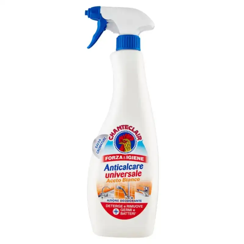 DESCRIERE: Chanteclair Detartrant Universal Otet Alb 625ml. Chanteclair Universal Anti-calcar este eficient chiar și împotriva celui mai încăpățânat calcar. Folosit regulat, previne redepunerea. Formula speciala cu Otet Alb garanteaza o stralucire surprinzatoare. Acționează rapid respectând cromul. Indicat și împotriva urmelor de rugină. Detartrant universal Chanteclair White Vinegar. Curățător de suprafețe dure. Pericol. Provoacă iritarea pielii. Provoacă leziuni oculare grave. A nu se lăsa la îndemâna copiilor. Purtați mănuși de protecție și protejați-vă ochii și fața. În caz de contact cu pielea: Spălați bine cu apă și săpun. În caz de contact cu pchii : Clătiți cu atenție timp de câteva minute. Îndepărtați orice lentile de contact dacă este ușor să faceți acest lucru. Continuați clătirea. Sunați imediat un Centru de toxicologie sau un medic/medic. Dacă este nevoie de sfaturi medicale, aveți la îndemână recipientul sau eticheta produsului. Evitați să respirați aerosolii. Utilizați numai în aer liber sau într-o zonă bine ventilată. Contine: acid formic, caprylil/capril glucozid. UFI. INFORMATII PRODUS: Avertisment: Nu amestecați cu înălbitor sau cu alți detergenți. A nu se folosi pe marmura si pietre naturale, cazi emailate si colorate, lemn lacuit. Nu este potrivit pentru materiale precum alamă, cupru, aluminiu, zinc, sticlă mată, linoleum, cauciuc. Pe rezervoarele emailate albe, încercați mai întâi pe o parte ascunsă, nu folosiți produsul dacă suprafața își pierde strălucirea. Clătiți bine după utilizare, nu depășiți 5 minute. de contact. Instructiuni de utilizare: Pulverizati pe suprafata, lasati sa actioneze cateva secunde si clatiti bine cu apa. În cazul depunerilor de calcar persistent, lăsați-l să acționeze câteva minute înainte de clătire. COMPOZITIE: Compoziție chimică:, mai puțin de 5%: surfactant neionic, alte componente: parfum