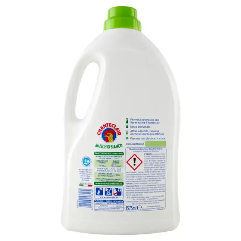 DESCRIERE: Mașină de spălat Chanteclair White Musk 1575 ml INFORMAȚII PRODUS: Doze recomandate (1 capac = 60 ml) 4/5 kg de rufe în mașina de spălat (apă medie 15 - 25 °f) Murdar mediu 45 ml | Foarte murdară 85 ml Apă dură (>25 °f) +15 ml Apă moale (<15 °f) - 15 ml Rufe de mână pentru 10 litri de apă 45 ml Pentru rufe mai mari sau egale cu 6-7 kg adăugați 25 ml Număr de doze standard : 35 Atenţie: la spălarea ţesăturilor sintetice, reduceţi dozele cu 1/3 pentru a evita problemele de spumă. COMPOZIȚII: Între 5 și 15%: Agenți tensioactivi anionici <5%: Agenți tensioactivi non-lonici, săpun, înălbitor optic, enzime, parfum, piritionă de sodiu, benzisotiazolinonă, metiizotiazolinonă, alfa-izometil iononă, benzil salicilat de benzil, butilpropionil, citronello de benzil, propionalmarin, Hexyl Cinnamal, Linalool