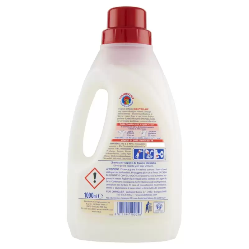 DESCRIERE: Chanteclair Săpun De Rufe Marsilia 1000 ml. Săpunul de rufe Chanteclair cu săpun de origine naturală, curăță delicat țesăturile respectând fibrele și culorile acestora. Oferă articolelor de îmbrăcăminte tratate parfumul curat tipic al săpunului de Marsilia. Potrivit pentru spălarea zilnică manuală și la mașină. Provoacă o iritare gravă a ochilor. INFORMATII PRODUS: Doze recomandate 1 capac = 75 ml În mașina de spălat pentru 2,5 kg de rufe uscate Cu mâna în 10 L de apă Ușor murdară 55 ml | Murdărie normală 75 ml Apă dură (>25 °F) + 20 ml - Apă moale (<15 °F) - 10 ml Număr de doze standard: 18. COMPOZITIE: Conține:, Între 5 și 15%: Agenți tensioactivi anionici, < 5%: Agenți tensioactivi neionici și săpun, Alte componente: Parfum, Enzime, Benzisotiazolinonă, Piritiona de sodiu, Laurilamină Dipropilendiamină, Citronellol, Geraniol, Limonen.