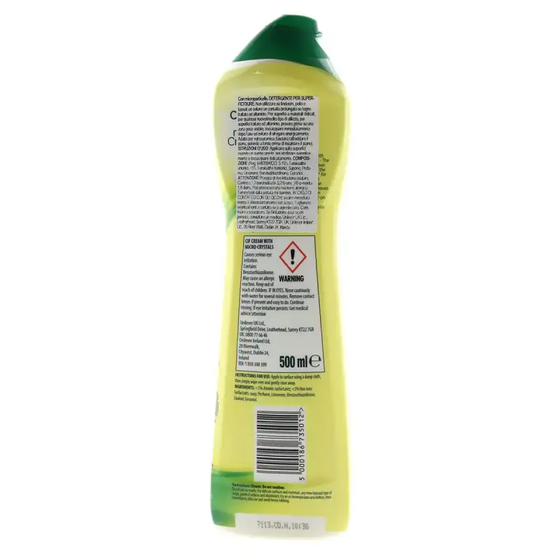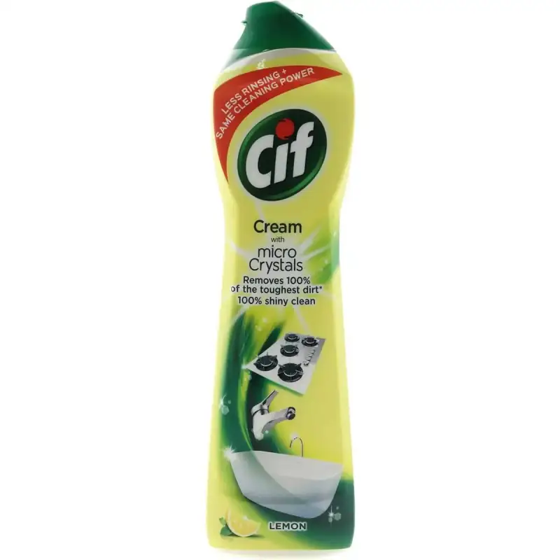 DESCRIERE: CIF crema de lamaie 500 ml Crema Cif cu Micro-Cristale îndepărtează 100% din murdăria cea mai încăpățânată, pentru a oferi suprafețelor tale o curățare strălucitoare. Formula sa cu Micro-Cristale, ușor de clătit, pătrunde și îndepărtează murdăria precum grăsimea încrustă, reziduurile alimentare arse și petele de calcar, pentru o curățare strălucitoare în toată casa. ATENȚIE Cif Lemon Cream Provoacă iritații grave ale ochilor. Poate provoca o reacție alergică a pielii. Conține 2-metil-2H-izotiazol-3-onă. A nu se lăsa la îndemâna copiilor. Purtați mănuși de protecție. ÎN CAZ DE CONTACT CON OCHI: Clătiți bine timp de câteva minute. Scoateți orice lentile de contact dacă este ușor de făcut. Continuați clătirea. IN CAZ DE CONTACT CU PIELEA: Se spala cu multa apa. Dacă iritația ochilor persistă: Dacă apare iritația sau erupția cutanată: Solicitați asistență medicală. DETERGENT PENTRU SUPRAFETE DURE. Avertismente: A nu se ingera. Nu utilizați pe țesături. Pentru suprafețe și materiale mai delicate, suprafețe noi, vopsite și aluminiu, încercați mai întâi o zonă mică, clătiți imediat după utilizare și nu frecați tare.
