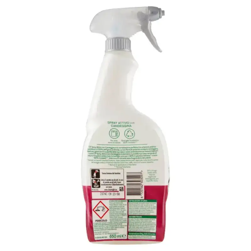 DESCRIERE: Cif Active Spray cu Albitor 650 ml Active Spray cu Înălbitor Pentru zonele de gătit 50% sticlă de plastic reciclat** Cif Active Spray cu Înălbitor este combinația perfectă între o acțiune zilnică de curățare și 100% igiena profundă. Formula sa puternică conține înălbitor, ideal pentru igienizarea suprafețelor casei tale și ca pre-tratament pe țesăturile albe*. Noul spray Cif Active cu înălbitor are grijă de casa ta încercând să reducă impactul asupra mediului: sticlele sunt fabricate 50% din plastic reciclat** și sunt 100% reciclabile***. Asigurați-vă că le reciclați bine (urmând instrucțiunile). Igienizează suprafețele și țesăturile* * Testat pe țesături standard (bumbac, amestec de poliester/bumbac). Aplicat pe pată înainte de spălare ajută la îndepărtarea petelor precum vin, cafea, suc de fructe și ruj. ** Excluzând pulverizatorul și eticheta. *** Fără etichetă. PERICOL Cif spray activ cu înălbitor Provoacă leziuni oculare grave. Provoacă iritarea pielii. Nociv pentru organismele acvatice cu efecte de lungă durată. Conține acizi sulfonici, alcan C14-17-sec, săruri de sodiu. A nu se lăsa la îndemâna copiilor. Protejați-vă ochii/fața. ÎN CONTACT CU OCHII: Clătiți bine timp de câteva minute. Îndepărtați orice lentile de contact dacă este ușor să faceți acest lucru. Continuați clătirea. Contactati imediat CENTRUL ANTOXICOLOGIC din Niguarda (02.66101029). ÎN CAZ DE CONTACT CU PIELEA: Spălați bine cu apă. În caz de iritare a pielii: consultați un medic. Aruncați recipientul în recipientele adecvate pentru colectarea separată a deșeurilor. UFI:VPS6-U0EJ-900T-YQPD AVERTIZĂRI: A nu se ingera. Nu utilizați pe covoare și tapițerie. Nu utilizați pe lemn, linoleum, aluminiu, oțel și suprafețe deteriorate. Clătiți rapid după utilizare pe suprafețe cromate sau placate. Nu utilizați pe lână, mătase, piele, țesături sintetice sau articole de îmbrăcăminte colorate. Utilizați întotdeauna pe suprafețe reci. Nu utilizați pe scrieri și simboluri. Urmați întotdeauna manualul de utilizare pentru aparatul/îngrijirea suprafeței. Pentru utilizare pe suprafețe noi sau neobișnuite, testați pe o zonă mică, neobservată. Stai departe de copii. Evita contactul cu ochii. În caz de contact cu ochii, spălați imediat și din abundență cu apă. INFORMATII PRODUS: Instructiuni de utilizare: Pulverizati produsul pe suprafete si stergeti cu o carpa umeda. Clătiți bine după utilizare pe zonele de gătit. În caz de murdărie încăpățânată, lăsați să acționeze câteva clipe. Pentru a pretrata țesăturile albe, acoperiți pata în întregime și lăsați să acționeze timp de 5 minute. Continuați să spălați ca de obicei. Testați pe o suprafață mică înainte de a utiliza pe suprafețe noi sau delicate. COMPOZIȚIE: Compoziție (Reg. 648/2004/EC):, <5% agenți tensioactivi anionici, Albitori pe bază de clor, Parfum, Metilizotiazolinonă, Metilcloroizotiazolinonă