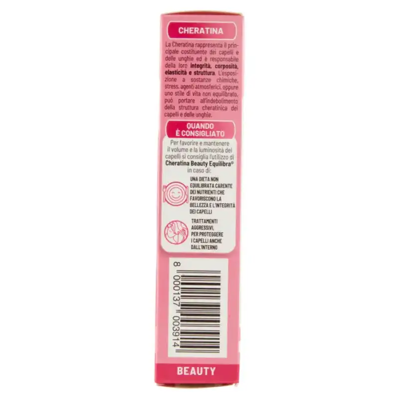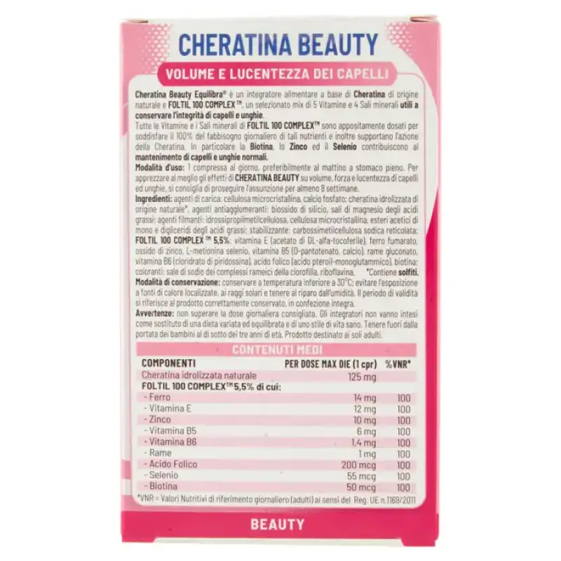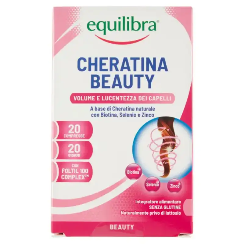 Keratina Beauty Volum și strălucire a părului Keratina Beauty Equilibra este un supliment alimentar pe bază de Keratină de origine naturală și Complex Foltil 100, un amestec selectat de 5 Vitamine și 4 Săruri Minerale utile pentru menținerea integrității părului și a unghiilor. Toate vitaminele și sărurile minerale din Complexul Foltil 100 sunt special dozate pentru a satisface 100% din necesarul zilnic al acestor nutrienți și, de asemenea, pentru a sprijini acțiunea Keratinei. În special, biotina, zincul și seleniul contribuie la menținerea parului și a unghiilor normale. Keratina Keratina reprezintă principalul constituent al părului și unghiilor și este responsabilă pentru integritatea, corpul, elasticitatea și structura acestora. Expunerea la substanțe chimice, stres, agenți atmosferici sau un stil de viață dezechilibrat poate duce la slăbirea structurii keratinei a părului și a unghiilor.