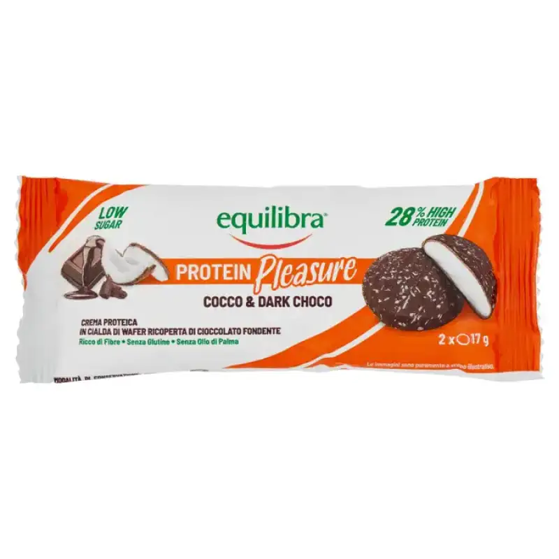 DESCRIERE: Equilibra Protein Pleasure Snack Cocos & Dark Choco 2 x 17g