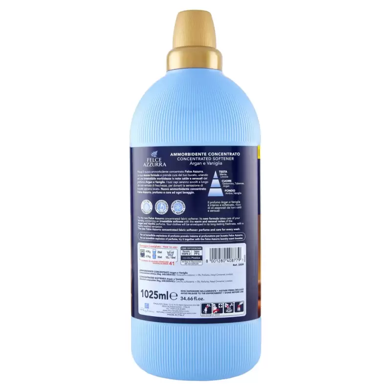 DESCRIERE: Felce Azzurra Balsam Concentrat De Argan Si Vanilie 1025 ml. Balsam concentrat Felce Azzurra Argan și vanilie Încercați noul balsam concentrat Felce Azzurra. Noua sa formulă are grijă de rufele tale, combinând o moliciune irezistibilă cu notele calde și senzuale ale parfumului de Argan și Vanilie. Hainele tale vor fi invaluite intr-o suflare de prospetime pentru o perioada indelungata, pentru a-ti oferi senzatia de rufe proaspat spalate. Noul balsam concentrat Felce Azzurra, parfum și îngrijire la fiecare spălare. Extra moliciune Testat dermatologic Eliberare prelungită a parfumului Top Mentă, Lemon Heart Iasomie, Tuberoză, Argan Bază Ambră, Vanilie Mirosul de Argan și Vanilie este intens și sofisticat, bogat în uleiuri esențiale cu tonuri calde și senzuale Pentru o explozie incredibilă de parfum, încercați-l împreună cu parfumul Felce Azzurra laund. INFORMATII PRODUS: Dozaj recomandat: Spalare la masina 4-5Kg | 25ml Se spala la masina 6-7Kg | 35ml Manual 10L / 10ml Număr de spălări standard 41 Agitați înainte de utilizare. COMPOZITIE: Compoziție chimică (Reg. 648/2004/CE):, Agenți tensioactivi cationici: < 5%, Parfum, Hexyl Cinnamal, Linalool