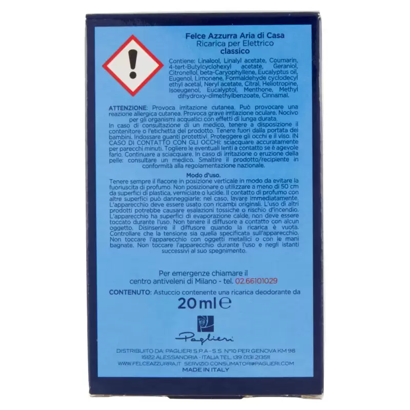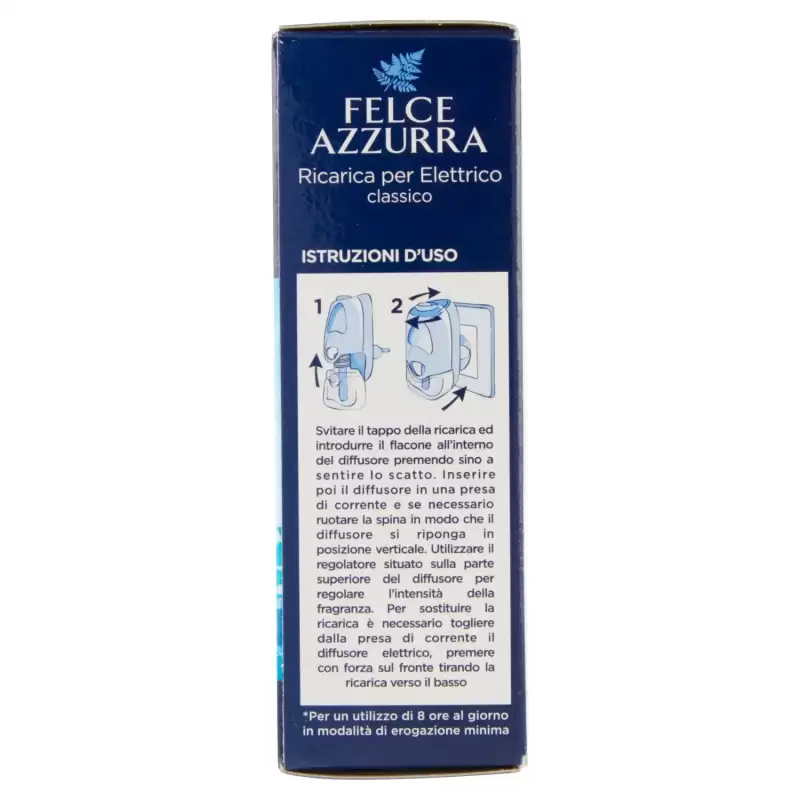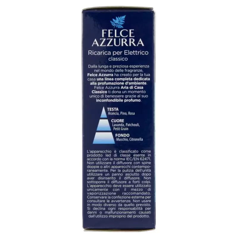 DESCRIERE: Felce Azzurra Aria di Casa Rezervă pentru electrice clasice 20 ml. Din experiența sa îndelungată și prețioasă în lumea parfumurilor, Felce Azzurra a creat o linie completă dedicată parfumurilor de cameră pentru casa ta. Felce Azzurra Aria di Casa Classico vă oferă un moment unic de bunăstare datorită parfumului său inconfundabil. Portocala de cap, pin, trandafir inimă lavandă, paciuli, mosc de bază Petit Grain, iarbă de lămâie. INFORMATII PRODUS: Instrucțiuni de utilizare Deșurubați capacul de umplere și introduceți sticla în difuzor apăsând până când auziți un clic. Apoi introduceți difuzorul într-o priză și, dacă este necesar, rotiți ștecherul astfel încât difuzorul să fie plasat în poziție verticală. Utilizați regulatorul situat în partea de sus a difuzorului pentru a regla intensitatea parfumului. Pentru inlocuirea rezervei este necesar sa scoateti difuzorul electric din priza, apasati ferm pe fata tragand rezervul in jos.