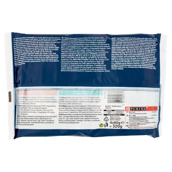 Fără culori - Același gust grozav - 2x Cu Somon, cu Ton în sos - Fileuri gustoase - 4x Plicuri - 100% Complet și echilibrat - Vitamine D&E - Sursă de acizi grași Omega-6 - Fără arome artificiale adăugate - Fără conservanți artificiali adăugați INFORMAȚII PRODUS Rație zilnică recomandată: pentru o pisică adultă de aproximativ 4 kg, se servesc 3 până la 4 plicuri pe zi în cel puțin 2 mese separate. Cantitățile zilnice recomandate se referă la pisici moderat active în medii cu temperatură normală. Este recomandabil să ajustați rația zilnică la nevoile specifice ale pisicii dvs. pentru a o menține în formă. Se serveste la temperatura camerei. Lăsați întotdeauna apă proaspătă și curată disponibilă. Pentru o pisică adultă sterilizată care cântărește aproximativ 4 kg, administrați până la 3 plicuri pe zi în cel puțin 2 mese separate.
