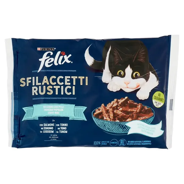 Felix Sfilaccetti de pisică rustică cu somon și pungă de ton Gr 80X4 buc, Bax 12 buc