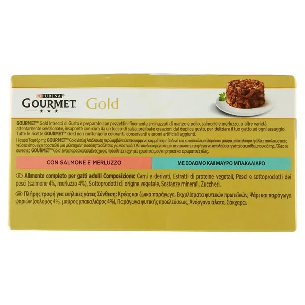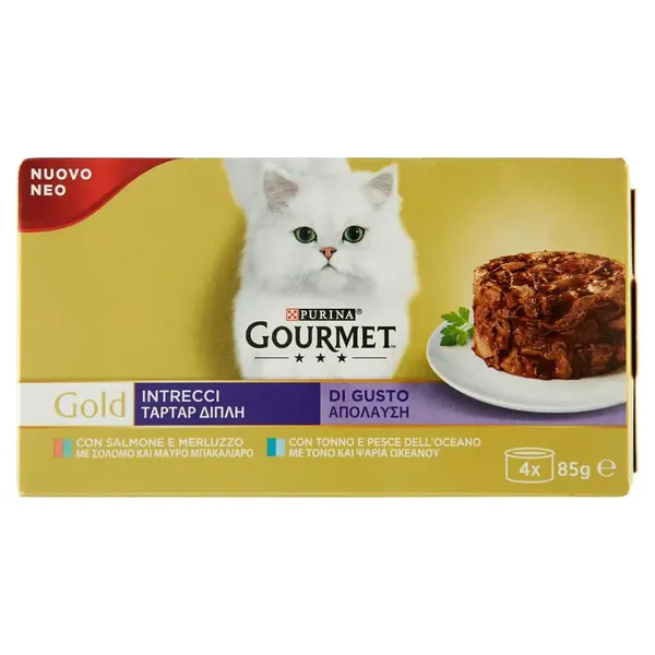GURMET Hrană pentru pisici Împătrundere de gust cu somon / cod și ton / pește oceanic 4x85g GOURMET Gold Intrecci di Gusto se prepara cu bucati de vita si pui tocate marunt, somon si cod, sau alte soiuri atent selectionate, atent aromate cu o nota de sos: creatii delicioase cu dublu gust, pentru a-ti incanta pisica cu toate gusturile. Toate rețetele GOURMET Gold nu conțin coloranți, conservanți și arome artificiale adăugate. - Nou - Cu somon și cod - Cu ton și pește oceanic