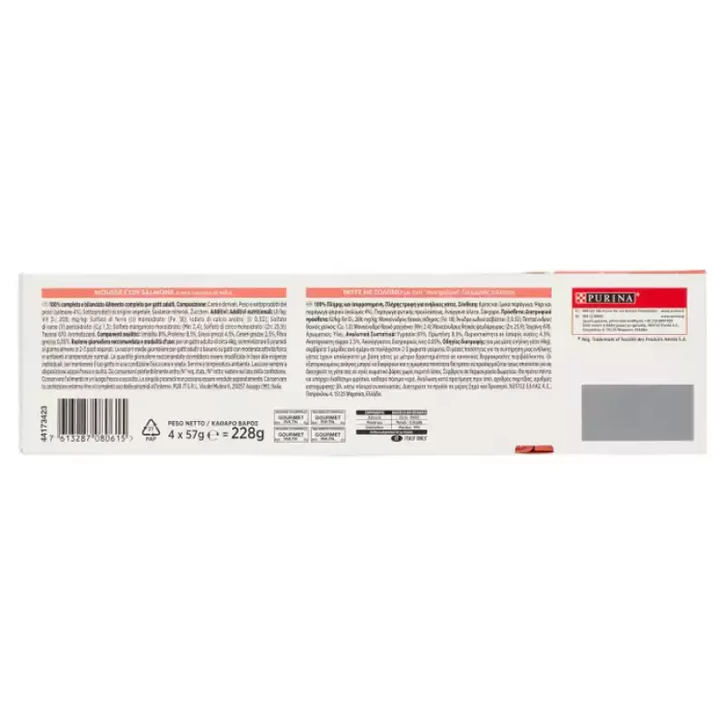 DESCRIERE: Hrana gourmet pentru pisici Revelations Mousse cu somon cu sos in cascada 4x57 g Perfect creat în formă de piramidă pentru a face din fiecare masă o revelație autentică.Pregătit cu ingrediente de înaltă calitate.Fără coloranți. Fara conservanti adaugati si arome artificiale. Conceput pentru a fi reciclabil Toate ambalajele au fost concepute pentru a fi reciclate purina.eu/packaging - 4x INFORMATII PRODUS: Ratie zilnica recomandata si instructiuni de utilizare: pentru o pisica adulta care cantareste aproximativ 4 kg, administrati 5 piramide pe zi cel putin in 2-3 mese separate. Rațiile medii zilnice pentru pisicile adulte se bazează pe pisici cu activitate fizică moderată în medii cu temperatură normală. Cantitățile zilnice recomandate trebuie modificate în funcție de nevoile individuale, pentru a vă menține pisica într-o condiție corporală sănătoasă și zveltă. Se serveste la temperatura camerei. Lăsați întotdeauna apă proaspătă și curată disponibilă. COMPOZIȚIE: Carne și derivate (46% din care vită 4%), Subproduse de origine vegetală, Substanțe minerale, Zaharuri.