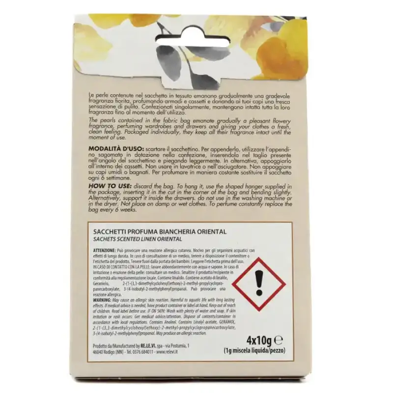 DESCRIERE: Jardin Saci Cu Parfum De Pânză Orientală. Perlele conținute în geantă eliberează treptat un parfum floral plăcut, parfumând dulapurile și sertarele și oferind hainelor tale o senzație de proaspăt, curat. Ambalate individual, își păstrează întregul parfum intact până în momentul utilizării. Avertisment: Poate provoca o reacție alergică a pielii. Nociv pentru mediul acvatic cu efecte de lungă durată. INFORMATII PRODUS: Mod de utilizare: aruncați punga. Pentru a-l agăța, folosește cuierul modelat furnizat în pachet, introducându-l în tăietura din colțul pungii și îndoindu-l ușor. Alternativ, puneți-l în sertare. A nu se folosi în mașina de spălat sau uscător. Nu așezați pe haine umede sau ude. Pentru un parfum constant, înlocuiți punga la fiecare 6 săptămâni.