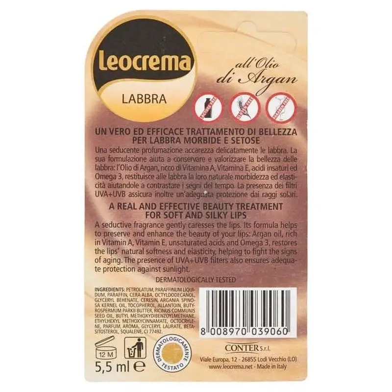 DESCRIERE: Un adevarat si eficient tratament de infrumusetare pentru buze moi si matasoasa Un parfum seducator mangaie delicat buzele. Formula sa contribuie la conservarea si de a spori frumusetea buzelor tale: Ulei de Argan, bogat in vitamina A, vitamina E, nesaturat si Omega 3, se intoarce la buze la moliciune lor naturala si elasticitate ajutand la combaterea semnelor de imbatranire. Prezenta UVA + UVB asigura, de asemenea, o protectie adecvata de razele soarelui. COMPOZITIE Pertrolatum, parafina lichida, parafina, Cera Alba, octildodecanol, gliceril behenat, Cerezina, Argania Spinosa Kernel ulei, Tocoferol, alantoina, Butyrospermum parkii Unt, Ricinus communis Ulei din seminte, butii Methoxydibenzoylmethane, etilhexil metoxicinamat, Octocrylene, Parfum, Aroma, gliceril laurat , Betasitosterol, squalene, CI 77492