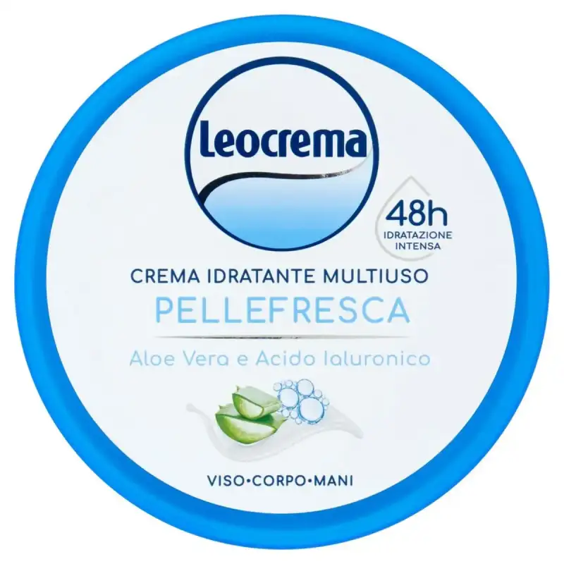 DESCRIERE: LEOCREMA Cremă hidratantă multifuncțională Fresh Skin Față Corp Mâini 300 ml Noua formulă de Leocrema Pellefresca, îmbogățită cu agenți de hidratare specifici precum Aloe și Acid Hialuronic, garantează pielii 48 de ore de hidratare intensă. Textura ușoară și fluidă se absoarbe rapid, nu este grasă și lasă pielea moale, proaspătă și mătăsoasă pentru o lungă perioadă de timp. Se absoarbe rapid si nu este gras.