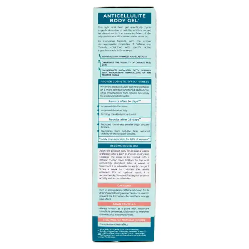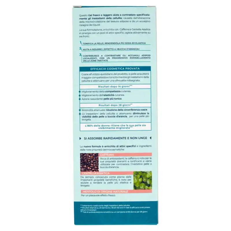 Acest gel proaspăt și ușor ajută la combaterea în mod specific a petelor celulitei, cauzate de alterarea microcirculației țesutului adipos și stagnarea excesivă a lichidelor. Formula sa, îmbogățită cu Cofeină și Centella Asiatica în sinergie cu un bazin de ingrediente active specifice, acționează activ pe trei fronturi: 1. Tonifică pielea, făcând-o mai fermă și mai elastică 2. Ajută la reducerea efectului de „coajă de portocală” » 3. Contribuie la contracararea depozitelor de grasime localizate, cu o remodelare progresiva a zonelor tratate.Eficacitate cosmetica dovedita.Datorita folosirii zilnice a produsului, pielea va capata o mai mare fermitate si tonus in timp ce petele celulitei sunt atenuate pentru o silueta reproiectata. Rezultate după 14 zile*** - Îmbunătățirea fermității pielii. - Imbunatatirea elasticitatii pielii. - Actiune de fermitate: piele mai tonifiata. Rezultate după 28 de zile** - Rotunzime redusă: reducerea circumferinței coapsei. - Petele celulitei sunt reduse: vizibilitatea pielii de coaja de portocala scade, pentru o piele mai fina. 80% dintre femei cred că pielea lor s-a îmbunătățit vizibil*** ** Rezultate obținute pe 20 de femei între 18 și 60 de ani în teste de eficacitate efectuate la institutele universitare. *** Test de autoevaluare efectuat pe un eșantion de 60 de femei timp de 28 de zile. Se absoarbe rapid si nu este gras.Noua formula este imbogatita cu ingrediente active specifice si ingrediente cu proprietati dermocosmetice binecunoscute: Cofeina Bogata in antioxidanti, cofeina este cunoscuta pentru proprietatile sale de drenare si tonifiere si este folosita pentru combaterea inesteticii peelingului pielii. portocale. Centella Asiatica Întotdeauna cunoscută ca o plantă cu proprietăți benefice importante, este cunoscută pentru că ajută la ca pielea să fie mai elastică și mai netedă. Mentol de origine naturala Pentru un efect proaspat placut.