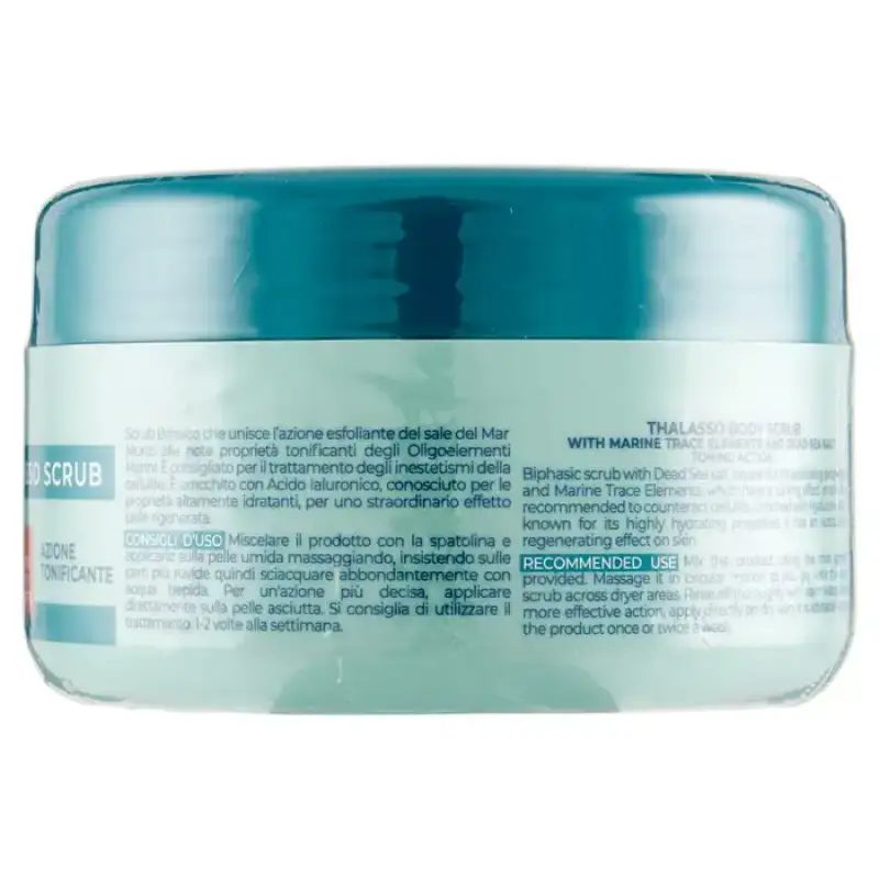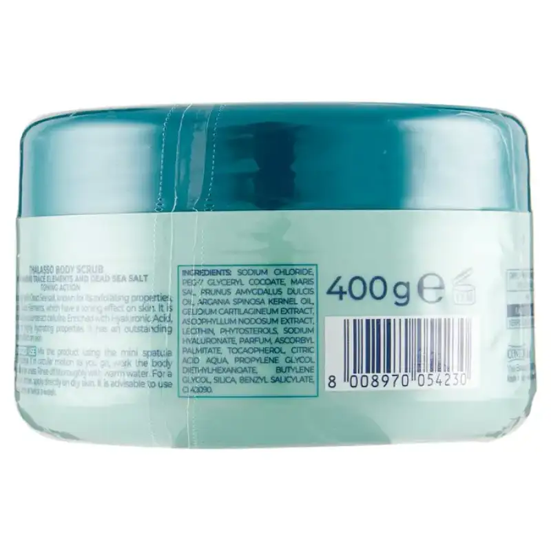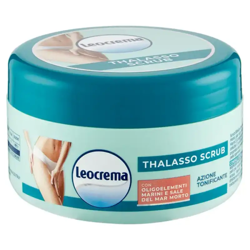 DESCRIERE: Leocrema Thalasso Scrub Toning Action 400 g Scrub bifazic care combină acțiunea exfoliantă a sării de la Marea Moartă cu binecunoscutele proprietăți de tonifiere ale oligoelementelor marine. Este recomandat pentru tratarea petelor celulitei. Este imbogatita cu Acid Hialuronic, cunoscut pentru proprietatile sale foarte hidratante, pentru un efect extraordinar de regenerat al pielii. INFORMATII PRODUS: Recomandari de utilizare Amestecati produsul cu spatula si aplicati-l pe pielea umeda, masand, acordand o atentie deosebita partilor mai aspre, apoi clatiti bine cu apa calduta. Pentru o acțiune mai decisivă, aplicați direct pe pielea uscată. Se recomandă utilizarea tratamentului de 1-2 ori pe săptămână. COMPOZIȚIE: Clorura de sodiu, Cocoat de gliceril PEG-7, Sal de Maris, Ulei de Prunus Amygdalus Dulcis, Ulei de sâmburi de Argania Spinosa, Extract de Gelidium Cartilagineum, Extract de Ascophyllum Nodosum, Lecitină, Fitosteroli, Hialuronat de sodiu, Parfumat de palmier, Tocorabil acid, Ascophyllum Nodosum. , propilenglicol dietilhexanoat, butilenglicol, silice, salicilat de benzil, CI 42090