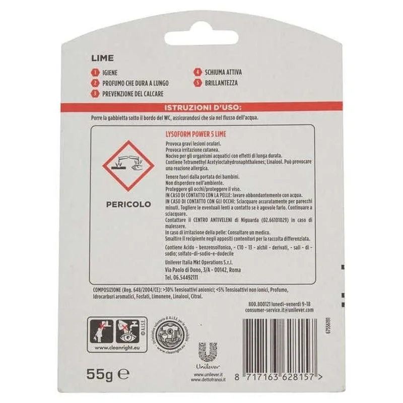 DESCRIERE: 1 Igiena 2 Parfum de lunga durata 3 Prevenirea calcarului 4 Spuma activa 5 Brilliance Informatii despre produs: Asezati cusca sub marginea toaletei, asigurandu-va ca aceasta se afla in fluxul de apa, cauzand leziuni oculare grave. Provoaca iritarea pielii. Nociv pentru viata acvatica cu efecte de lunga durata. Contine Tetrametil Acetiloctahidronftalenele; Linalool. Poate provoca o reactie alergica. A nu se lasa la indemana copiilor. Nu se disperseaza in mediu. Protejati ochii / protejati fata. IN CAZ DE CONTACT CU PIELEA: spalati-va cu multa apa. In caz de contact cu ochiul: clatiti bine cateva minute. Indepartati orice lentile de contact daca este usor de facut acest lucru. Continuati sa clatiti. Contactati CENTRUL DE POZIUNI din Niguarda (02.66101029) daca nu va simtiti rau. Daca apare iritatia pielii: Obtineti asistenta medicala. Eliminati recipientul in containerele adecvate pentru colectarea diferentiatului compozitie: COMPOZITIE (Reg. 648/2004 / CE):> 30% tensioactivi anionici; <5% surfactanti neionici, Parfum, Hidrocarburi aromatice, Fosfati, Limonen, Linalool, Citral.