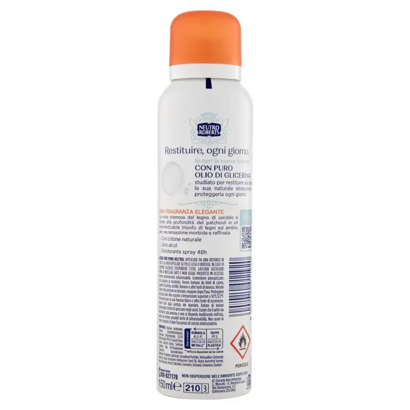 DESCRIERE: Neutral Roberts Dry Sandalwood and Patchouli 150 ml Dă înapoi, în fiecare zi. Descoperiți noua formulă cu ulei pur de glicerină concepută pentru a restabili hidratarea naturală a pielii și pentru a o proteja în fiecare zi. Un parfum elegant Nota cremoasa a lemnului de santal se imbina cu profunzimea patchouli intr-un triumf de neuitat al lemnului si chihlimbarului, pentru o senzatie moale si rafinata. - Cu bumbac natural - Zero alcool - Deodorant spray 48h INFORMAȚII PRODUS: Agitați bine înainte de utilizare. Se aplica de la o distanta de aproximativ 15 cm. Nu aplicați pe pielea deteriorată sau iritată. În caz de fenomene alergice, întrerupeți utilizarea. Lăsați să se usuce înainte de a vă pune hainele și nu folosiți exces de produs. COMPOZIȚIE: Butan, izobutan, propan, ciclopentaiutoxan, clorhidrat de aluminiu, benzoat de alchil C12-15, eter stearilic PPG-15, parfum, oleat de gliceril, caprilat de sorbitan, talc, copolimer VP/hexadecen, stearalconiu tearil benzoat, propanil tearil benzotat Diacetat de glutamat, Aqua, ulei de semințe de gossypium herbaceum, alfa-izometil iononă, benzoat de benzil, salicilat de benzil, cumarină, geraniol, limonen, linalol