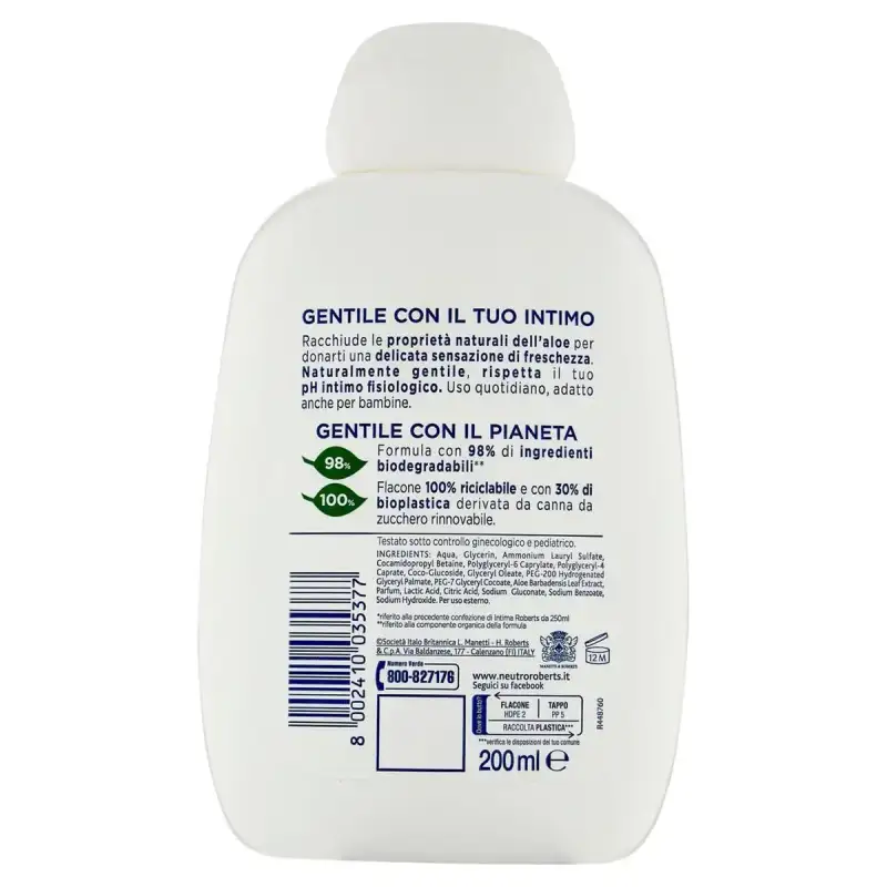 DESCRIERE: Detergent intim proaspat cu extract de Aloe Vera 200 ml Bland cu lenjeria ta Contine proprietatile naturale ale aloelui pentru a-ti oferi o senzatie delicata de prospetime. În mod natural blând, respectă-ți pH-ul intim fiziologic. Utilizare zilnică, potrivit și pentru fetițe. Kind to the Planet 98% - Formula cu 98% ingrediente biodegradabile ** 100% - 100% sticla reciclabila si 30% bioplastic derivat din trestie de zahar regenerabila. ** se referă la componenta organică a formulei Testat sub control ginecologic și pediatric.