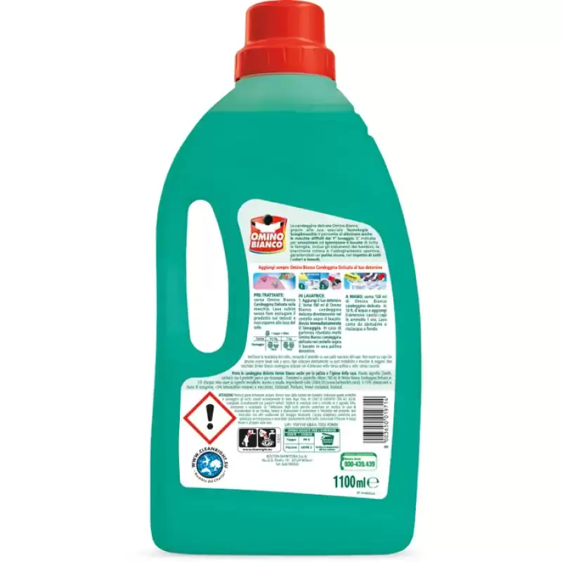 DESCRIERE: Omino Bianco Înălbitor delicat Îndepărtează petele și respectă culorile Mosc alb 1100ml Înălbitorul delicat Omino Bianco datorită tehnologiei sale speciale de eliberare a petelor vă permite să eliminați chiar și petele dificile de la prima spălare. Este potrivit pentru indepartarea petelor si igienizarea rufelor intregii familii, inclusiv imbracamintea copiilor, lenjeria intima si imbracamintea sport, garantand o curatare sigura, respectand toate culorile si tesaturi. ATENȚIE Provoacă o iritare gravă a ochilor. A nu se lăsa la îndemâna copiilor. Purtați mănuși de protecție și protecție pentru ochi. Spălați bine mâinile după utilizare. ÎN CAZ DE CONTACT CU OCHII: Clătiți cu atenție timp de câteva minute. Îndepărtați orice lentile de contact dacă este ușor să faceți acest lucru. Continuați clătirea. Dacă iritația ochilor persistă, consultați un medic. Dacă este nevoie de sfaturi medicale, aveți la îndemână recipientul sau eticheta produsului. A nu se amesteca cu alte produse de albire de spalare. Peroxidul de hidrogen conținut poate provoca o albire temporară și reversibilă a pielii. Păstrați flaconul într-un loc răcoros ferit de lumină. INFORMAȚII PRODUS: Adăugați întotdeauna Omino Bianco Candeggina Delicata la detergentul dvs. Pre-tratament: turnați Omino Bianco Candeggina Delicata pe pată. Spălați imediat fără a lăsa produsul să se usuce pe țesături și nu expuneți la lumina soarelui. În mașina de spălat: 1. Adăugați detergentul dvs. 2. Turnați 100 ml de înălbitor delicat Omino Bianco direct în tamburul de deasupra rufelor. Începeți imediat spălarea. În cazul plecării întârziate, puneți înălbitor delicat Omino Bianco în tambur deasupra rufelor într-o minge de măsurare. Cu mâna: turnați 100 ml de înălbitor delicat Omino Bianco în 10 lt. de apă și adăugați detergentul. Lasă hainele la macerat timp de 1 oră. Spălați ca de obicei și clătiți bine. 1 capac = 80ml Încărcare 4-5 Kg | Dozare 100ml Sarcina 7 Kg | Dozare 150ml Verificati rezistenta culorilor turnand produsul pe o parte ascunsa a hainei. A nu se utiliza numai pe haine destinate curățării uscate. Nu utilizați direct pe părți metalice sau pe pete de rugină. Nu amestecați înălbitorul delicat Omino Bianco cu detergentul în aceeași minge sau în același sertar. Încercați înălbitorul delicat Omino Bianco și pentru curățarea și igiena acasă. Suprafețe mici (chiuvete, corpuri de baie): utilizați produsul pur și apoi clătiți. - Podele și gresie: diluați 100 ml de Omino Bianco Candeggina Delicata în 5 litri. de apa. A nu se utiliza pe suprafete metalice, marmura sau emailate. COMPOZIȚIE: Ingrediente-648/2004/EC(www.boltondet.com):, 5-15% Înălbitori pe bază de oxigen, <5% Surfactanți anionici și neionici, fosfonați, Parfumuri, Hexyl cinnamal, Linalool