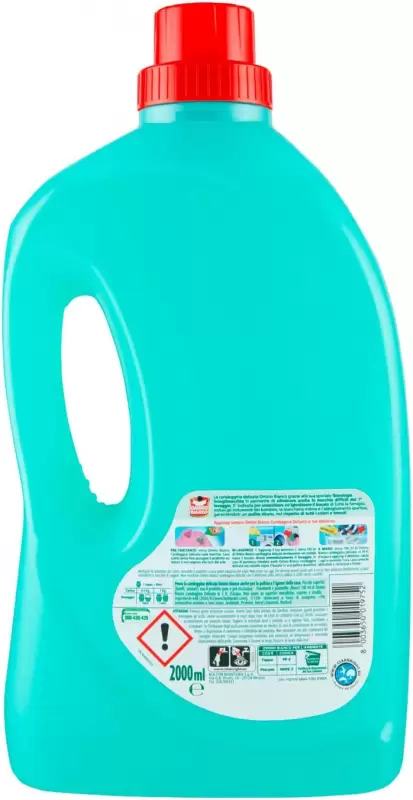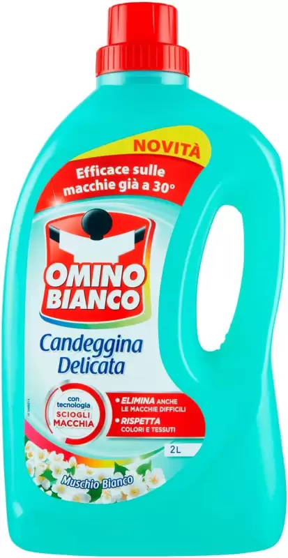 DESCRIERE: Omino Bianco Înălbitor delicat Îndepărtează petele și respectă culorile Mosc alb 2000 ml Înălbitorul delicat Omino Bianco datorită tehnologiei sale speciale de eliberare a petelor vă permite să eliminați chiar și petele dificile de la prima spălare. Este potrivit pentru indepartarea petelor si igienizarea rufelor intregii familii, inclusiv imbracamintea copiilor, lenjeria intima si imbracamintea sport, garantand o curatare sigura, respectand toate culorile si tesaturi. ATENȚIE Provoacă o iritare gravă a ochilor. A nu se lăsa la îndemâna copiilor. Purtați mănuși de protecție și protecție pentru ochi. Spălați bine mâinile după utilizare. ÎN CAZ DE CONTACT CU OCHII: Clătiți cu atenție timp de câteva minute. Îndepărtați orice lentile de contact dacă este ușor să faceți acest lucru. Continuați clătirea. Dacă iritația ochilor persistă, consultați un medic. Dacă este nevoie de sfaturi medicale, aveți la îndemână recipientul sau eticheta produsului. A nu se amesteca cu alte produse de albire de spalare. Peroxidul de hidrogen conținut poate provoca o albire temporară și reversibilă a pielii. Păstrați flaconul într-un loc răcoros ferit de lumină. INFORMAȚII PRODUS: Adăugați întotdeauna Omino Bianco Candeggina Delicata la detergentul dvs. Pre-tratament: turnați Omino Bianco Candeggina Delicata pe pată. Spălați imediat fără a lăsa produsul să se usuce pe țesături și nu expuneți la lumina soarelui. În mașina de spălat: 1. Adăugați detergentul dvs. 2. Turnați 100 ml de înălbitor delicat Omino Bianco direct în tamburul de deasupra rufelor. Începeți imediat spălarea. În cazul plecării întârziate, puneți înălbitor delicat Omino Bianco în tambur deasupra rufelor într-o minge de măsurare. Cu mâna: turnați 100 ml de înălbitor delicat Omino Bianco în 10 lt. de apă și adăugați detergentul. Lasă hainele la macerat timp de 1 oră. Spălați ca de obicei și clătiți bine. 1 capac = 80ml Încărcare 4-5 Kg | Dozare 100ml Sarcina 7 Kg | Dozare 150ml Verificati rezistenta culorilor turnand produsul pe o parte ascunsa a hainei. A nu se utiliza numai pe haine destinate curățării uscate. Nu utilizați direct pe părți metalice sau pe pete de rugină. Nu amestecați înălbitorul delicat Omino Bianco cu detergentul în aceeași minge sau în același sertar. Încercați înălbitorul delicat Omino Bianco și pentru curățarea și igiena acasă. Suprafețe mici (chiuvete, corpuri de baie): utilizați produsul pur și apoi clătiți. - Podele și gresie: diluați 100 ml de Omino Bianco Candeggina Delicata în 5 litri. de apa. A nu se utiliza pe suprafete metalice, marmura sau emailate. COMPOZIȚIE: Ingrediente-648/2004/EC(www.boltondet.com):, 5-15% Înălbitori pe bază de oxigen, <5% Surfactanți anionici și neionici, fosfonați, Parfumuri, Hexyl cinnamal, Linalool