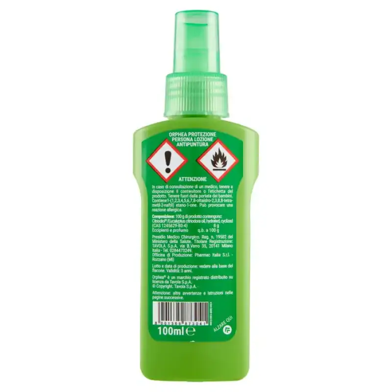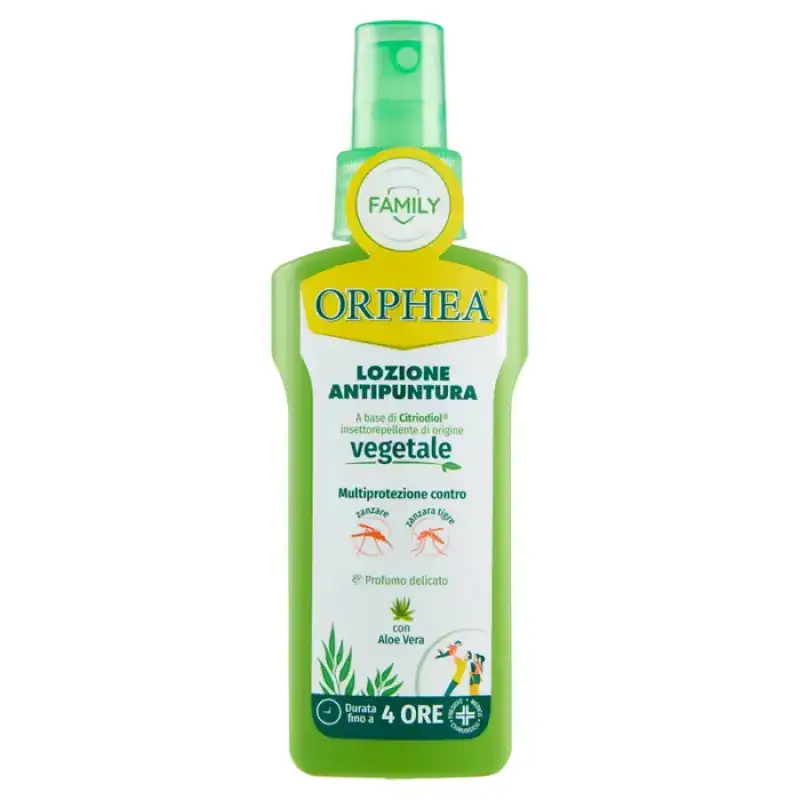 Orphea Personal Protection Anti-Bite Lotion protejeaza eficient pielea de intepaturile tantarilor, calarelor si altor insecte. Eficacitatea sa a fost testată și împotriva țânțarului tigru (Aedes albopictus). Formularea sa se bazeaza pe Citriodiol, o substanta cu activitate insectifuga de origine vegetala obtinuta din Eucalyptus citriodora. Aloe vera conferă pielii un efect plăcut de revigorare și hidratare. Orphea Personal Protection Anti-puncture Lotion protejeaza eficient pielea timp de peste 5 ore (*de la calare pana la 3 ore). Nu este gras și este plăcut parfumat. Poate fi folosit și pe țesături.
