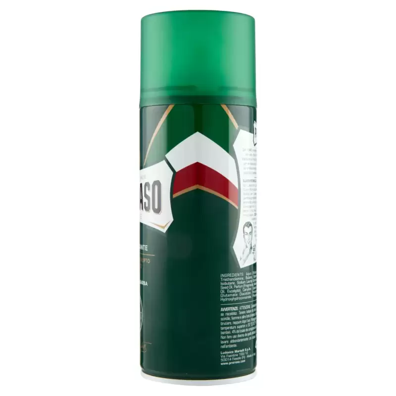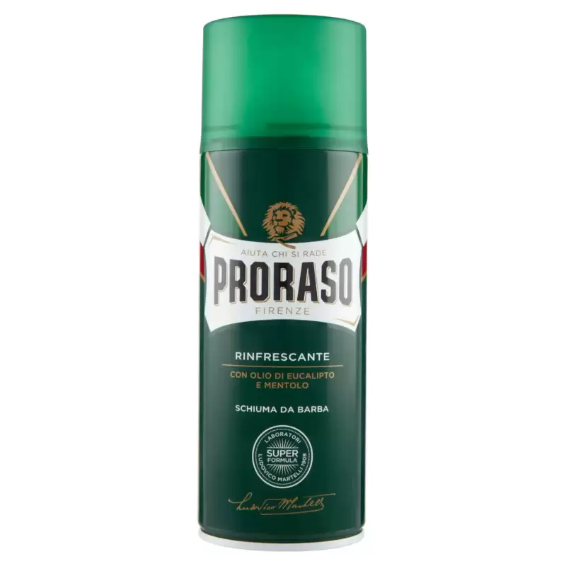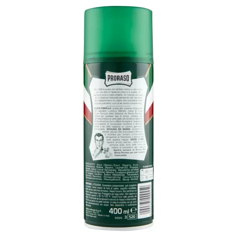 DESCRIERE: Proraso Spuma de ras revigorant 400 ml. Super Formula: datorită inovației constante a laboratoarelor Ludovico Martelli, ia naștere noua Super Formula a spumei de ras Proraso. Potrivit pentru orice tip de barbă, combină protecția perfectă a pielii cu ușurința de bărbierit chiar și cel mai dur și mai greu de tuns păr. Combinația specială de componente emoliente și hidratante face din ritualul de bărbierit o plăcere zilnică indispensabilă. Spuma de ras: imbogatita cu extracte naturale, ulei de eucalipt si mentol, este conceputa pentru a oferi o senzatie incredibila de prospetime si tonus tenului proaspat ras. Testat dermatologic. Atentie! Recipient sub presiune: Poate sparge dacă este încălzit. Țineți departe de căldură, suprafețe fierbinți, scântei, flăcări și alte surse de aprindere. Fumatul interzis. Nu perforați și nu ardeți, chiar și după utilizare. A se proteja de lumina soarelui. Nu expuneți la temperaturi care depășesc 50°C/122°F. A nu se lăsa la îndemâna copiilor. 4% din totalul componentelor în masă este inflamabil. Nu utilizați altceva decât cel indicat. În caz de contact cu ochii, clătiți bine cu apă. Nu aruncați recipientul în mediu.