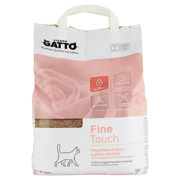 Signor Gatto Litier pentru pisici Fine Touch 5L Signor Gatto Fine Touch este un așternut igienic de înaltă calitate, realizat 100% din bentonită cu granulație fină. Dimensiunea redusă a granulelor asigură un confort mai mare pisicii dumneavoastră și permite o aglomerare foarte rapidă și formarea de mici bulgări solide, cu risipă minimă de produs. Signor Gatto Fine Touch, 100% natural, este îmbogățit cu un miros plăcut de talc, care se eliberează în contact cu lichidele.