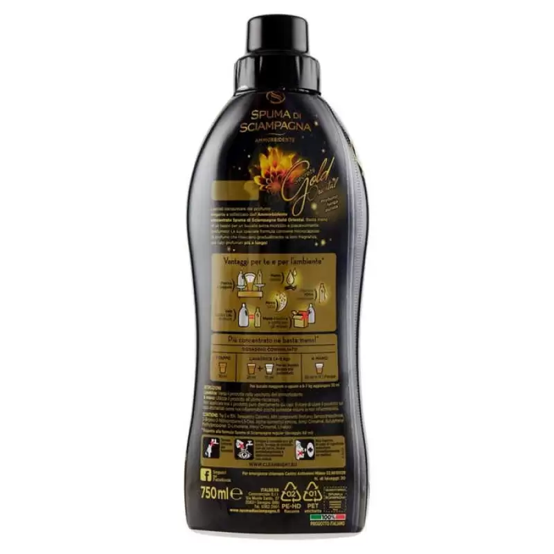 DESCRIERE: Lasa-te captivat de parfumul elegant si sofisticat al balsamului concentrat Spuma di Sciampagna Gold Oriental. Este nevoie de mai putin de un capac pentru o rufe extra moale si parfumata placut! Formula sa speciala contine microcapsule de parfum care isi elibereaza treptat parfumul, pentru haine parfumate mai mult timp! Avantaje pentru dumneavoastra si pentru mediu * Practic si usor Mai putina apa 100% flacon reciclabil Mai putin CO2 Merita la fel de 1,8 L de diluat Mai putin plastic si hartie pentru ambalare * In comparatie cu formula Spuma di Sciampagna obisnuita (doza 60 ml) Informatii despre produs: * Mai mult concentrat este suficient. * Dozare recomandata 1 Cap 30 ml Masina de spalat (4-5 kg) 25 ml + 10 ml Pentru o rufe si mai parfumata De mana 20 ml in 10 l de apa kg se adauga 30 ml * In comparatie cu formula Spuma di Sciampagna obisnuita (doza 60 ml) Instructiuni Masina de spalat: Turnati produsul in compartimentul de dedurizare. Mana: Folositi produsul la ultima clatire. Nu aplicati niciodata produsul pur direct pe articole de imbracaminte. Evitati utilizarea produsului pe articole etichetate ca fiind inflamabile, deoarece acestea ar putea reduce inflamabilitatea. compozitie: Contine:, intre 5 si 15%: tensioactivi cationici, alte componente: parfum, benzisotiazolinona, 2-brom-2-nitropropan-1,3-diol, alfa-izometil-ionona, amil cinamal, butilfenil metilpropional, D-limonen, hexil cinamal , Linalool