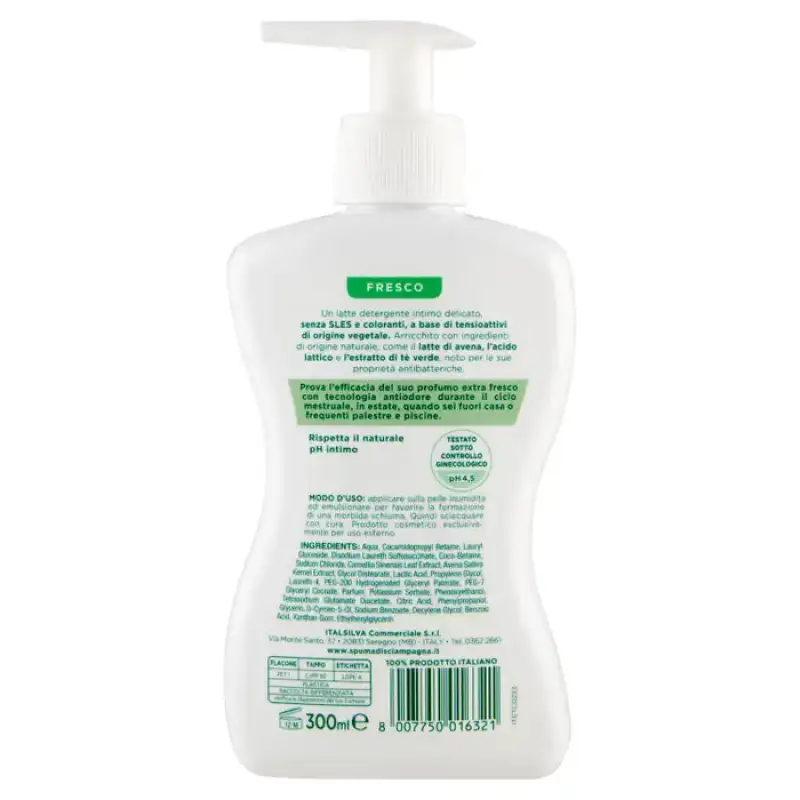 DESCRIERE: Spuma di Sciampagna Benessere Lapte demachiant intim proaspat 300 ml Un lapte demachiant intim delicat, fara SLES si coloranti, pe baza de surfactanti de origine vegetala. Îmbogățit cu ingrediente de origine naturală, precum laptele de ovăz, acid lactic și extract de ceai verde, cunoscut pentru proprietățile sale antibacteriene. Încercați eficacitatea parfumului său extra fresh cu tehnologie anti-miros în timpul ciclului menstrual, vara, când sunteți departe de casă sau frecventați sălile de sport și piscinele. Respectă pH-ul intim natural Testat sub supraveghere ginecologică - pH 4,5 Produs 100% italian INFORMATII PRODUS: Mod de utilizare: aplicati pe pielea umeda si emulsionati pentru a favoriza formarea unei spume moale. Apoi clătiți bine. Produs cosmetic numai pentru uz extern. COMPOZIȚIE: Aqua, cocamidopropil betaină, lauril glucozidă, disodiu laureth sulfosuccinat, coco-betaină, clorură de sodiu, extract de frunze de Camellia Sinensis, extract de sâmburi de Avena Sativa, distearat de glicol, acid lactic, propilenglicol, laureth-40, hidrogenat de lauret-20, palmogenat , Cocoat de gliceril PEG-7, parfum, sorbat de potasiu, fenoxietanol, diacetat de glutamat tetrasodic, acid citric, fenilpropanol, glicerină, O-Cimen-5-ol, benzoat de sodiu, decilenglicol, acid benzoic, gumă xantanilglicerilică,