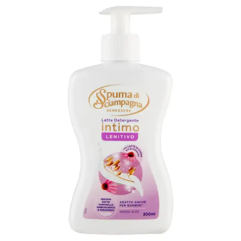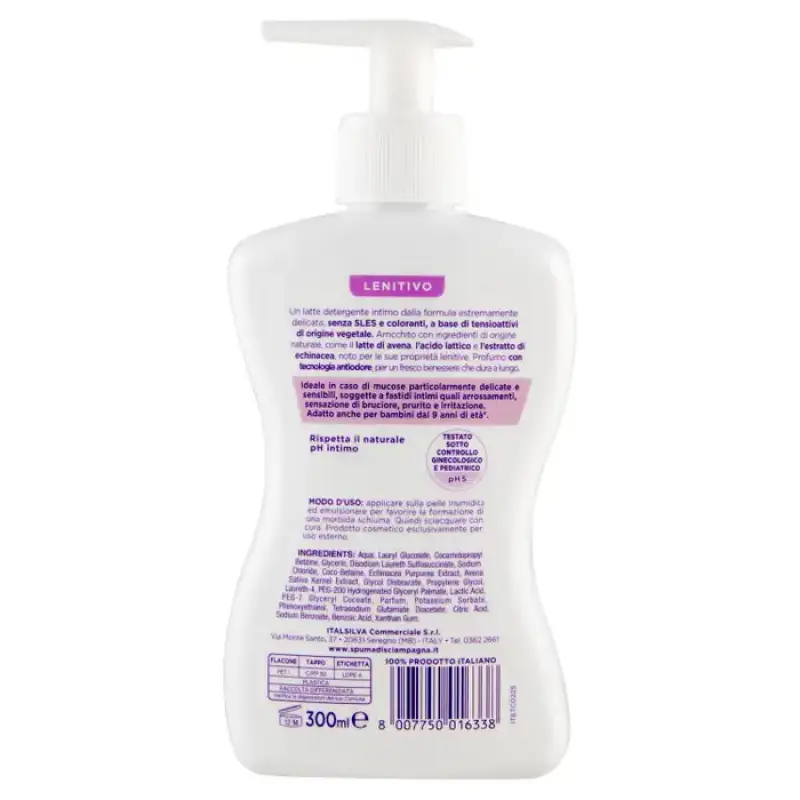 DESCRIERE: Spuma di Sciampagna Benessere Lapte demachiant intim calmant 300 ml Un lapte demachiant intim cu o formula extrem de delicata, fara SLES si coloranti, pe baza de surfactanti de origine vegetala. Îmbogățit cu ingrediente de origine naturală, precum laptele de ovăz, acid lactic și extract de echinacea, cunoscut pentru proprietățile sale calmante. Parfum cu tehnologie anti-miros, pentru o stare de bine proaspata de lunga durata. Ideal în cazul mucoaselor deosebit de delicate și sensibile, supuse unor disconforturi intime precum roșeață, senzație de arsură, mâncărime și iritație. Potrivit și pentru copiii de la 9 ani.* Respectă pH-ul intim natural Testat sub supraveghere ginecologică și pediatrică - pH 5 Produs 100% italian INFORMATII PRODUS: Mod de utilizare: aplicati pe pielea umeda si emulsionati pentru a favoriza formarea unei spume moale. Apoi clătiți bine. Produs cosmetic numai pentru uz extern. COMPOZIȚIE: Aqua, Lauryl Glucoside, Cocamidopropil Betaină, Glicerină, Disodium Laureth Sulfosuccinate, Clorură de sodiu, Coco-Betaină, Extract de Echinacea Purpurea, Extract de sâmburi Avena Sativa, Distearat de glicol, Propilen Glicol, Laureth-4, Hidrogenat lactic, 200 Glyceryl. Acid, cocoat de gliceril PEG-7, parfum, sorbat de potasiu, fenoxietanol, diacetat de glutamat tetrasodic, acid citric, benzoat de sodiu, acid benzoic, gumă de xantan