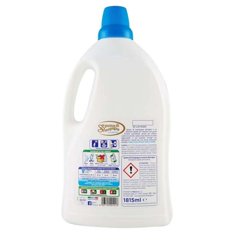 DESCRIERE: SPUMA DI SCIAMPAGNA Marseille Detergent Dezinfectant Masina de spalat 1485ml Detergent lichid dezinfectant eficient împotriva petelor. Parfumul său învăluie delicat țesăturile pentru o nouă senzație de curățenie. Produsul este testat dermatologic si iti respecta pielea. Spuma di Sciampagna Marseille Detergent lichid pentru mașini de spălat rufe ATENȚIE. Provoacă o iritare gravă a ochilor. A nu se lăsa la îndemâna copiilor. Protejați-vă ochii și fața. ÎN CAZ DE CONTACT CU OCHII: Clătiți cu atenție timp de câteva minute. Îndepărtați orice lentile de contact dacă este ușor să faceți acest lucru. Continuați clătirea. Dacă iritația ochilor persistă, consultați un medic. Dacă este nevoie de sfaturi medicale, aveți la îndemână recipientul sau eticheta produsului. INFORMAȚII PRODUS: Turnați produsul direct în cuva mașinii dvs. de spălat COMPOZIȚIE: Conține: Între 5 și 15%: Surfactanți anionici; <5%: surfactanți neionici, săpun și fosfonați; Alte componente: Parfum, Enzime, Benzisotiazolinona, Piritiona de sodiu, Citronellol, D-Limonene, Geraniol, Linalool, Metilizotiazolinona. ​