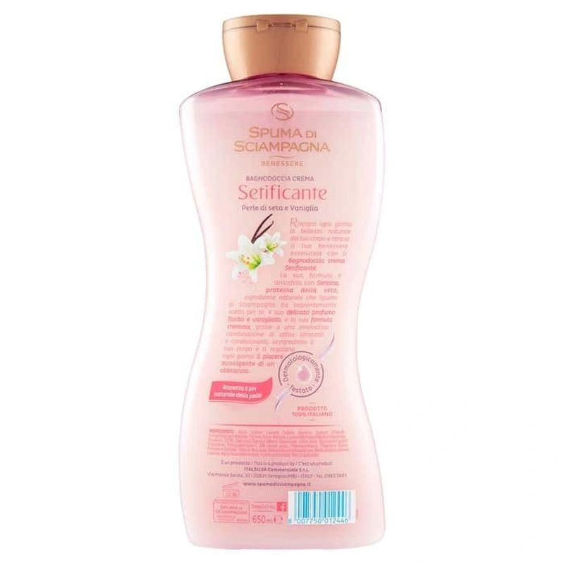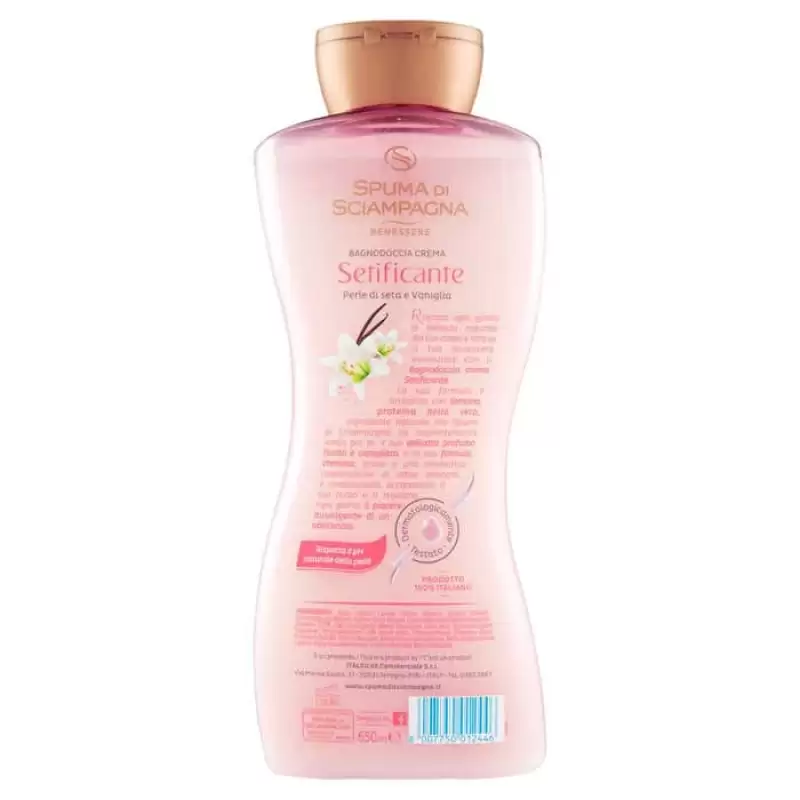 DESCRIERE: Redescopera in fiecare zi frumusetea naturala a corpului tau si iti redobandesti bunastarea esentiala cu ajutorul spalaturii matasoase. Formula sa este imbogatita cu sericina, proteine de matase, ingredient natural pe care Spuma di Sciampagna l-a ales cu intelepciune pentru tine, mirosul floral floral si delicat de vanilie si formula cremoasa, datorita unei combinatii inovatoare de hidratare si conditionare a ingredientelor active, mangaierii corpul tau si iti ofera placerea invaluitoare a unei imbratisari in fiecare zi. Testat dermatologic Respecta pH-ul natural al pielii.Produs 100% italian compozitie: Aqua, Sulfat Laureth Sulfat, Glicerina, Clorura de sodiu, Cocamidopropil Betaine, Parfum, Coco-Betaine, Lauroyl / Myristoyl Metil Glucamida, Disodium EDTA, Capryloyl / Caproyl Metil Glucamide, Acid citric, Styrene / Acrylumum , Fenoxietanol, Propilen Glicol, Sorbat de Potasiu, Benzoat de Sodiu, Metilcloroizotiazolinona, Metilizotiazolinona, Linalool, Alfa-Izometil Ionona, Hidroxicitronelul, Salicilat de benzil