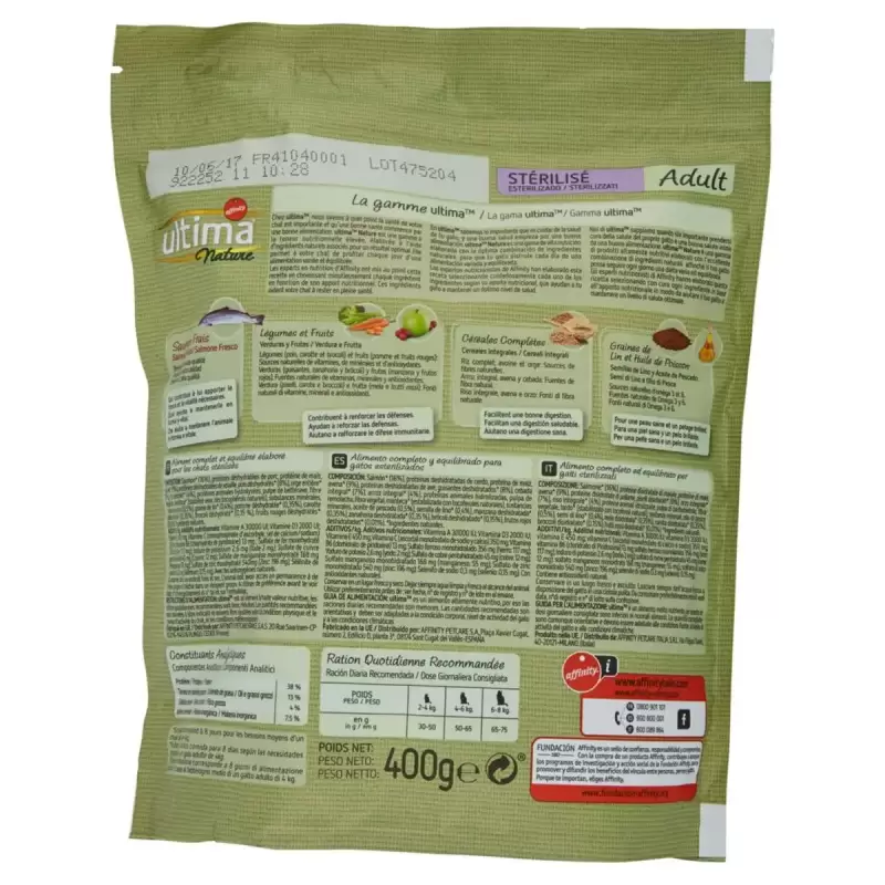Compozitie :, Somon de Atlantic * (16%, din care 4% proaspat), Proteine din porumb, Proteine deshidratate din pasare, Proteine deshidratate din carne de porc, Mazare deshidratata * (8%), Orz integral * (7%), Ovaz * ( 7%) , Orez brun* (4%), Proteine animale hidrolizate, Pulpa de sfeclă, Fibre vegetale*, Grăsimi animale*, Minerale, Morcov deshidratat* (0,5%, egal cu 4% morcov proaspăt), Ulei de pește* (0,5%), Broccoli deshidratat * (0,5% egal cu 4% din broccoli proaspăt), Semințe de in * (0,4%), Măr deshidratat * (0,35% egal cu 2,2% măr proaspăt), Ulei de floarea soarelui, Merișoare deshidratate * (0,01% egal cu 0,07% merisoare proaspete), * Ingrediente naturale