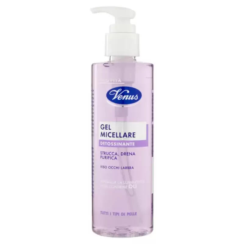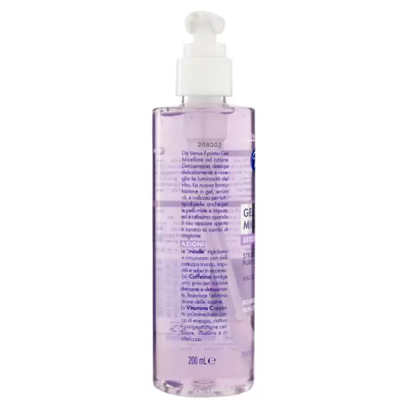 DESCRIERE: Venus Gel Micelar Detoxifiant 200 ml De la Venus primul Gel Micelar cu actiune detoxifianta, curata delicat si trezeste luminozitatea fetei. Noua formulă de gel, fără uleiuri, este potrivită pentru toate tipurile de ten, chiar și pentru tenul mixt și impur și este foarte utilă atunci când fața apare tern și tern din cauza schimbărilor sezoniere. INFORMAȚII PRODUS: Cum se utilizează Masați pe fața umedă și clătiți cu apă rece care favorizează drenajul și revitalizează pielea. COMPOZIȚIE: Aqua, Glicerină, Cocoamfodiacetat de disodiu, Acrilati/C10-30 Alchil Acrilat încrucișat, Sulfosuccinat disodic Laureth, Laurilsulfoacetat de sodiu, Cofeină, Pantenol, Ascorbil fosfat de sodiu, Decilendroxithanol, clorhidrat de sodiu, Paroxid glicolid de sodiu, yl alcool, Benzotriazolil butilfenol sulfonat de sodiu, citrat de tributil, buteth-3, acid citric, CI 42090, CI 17200 ​