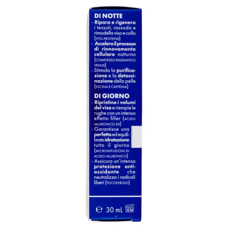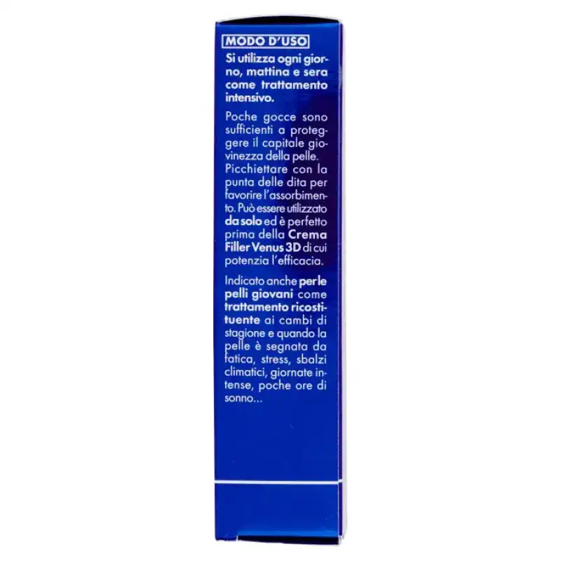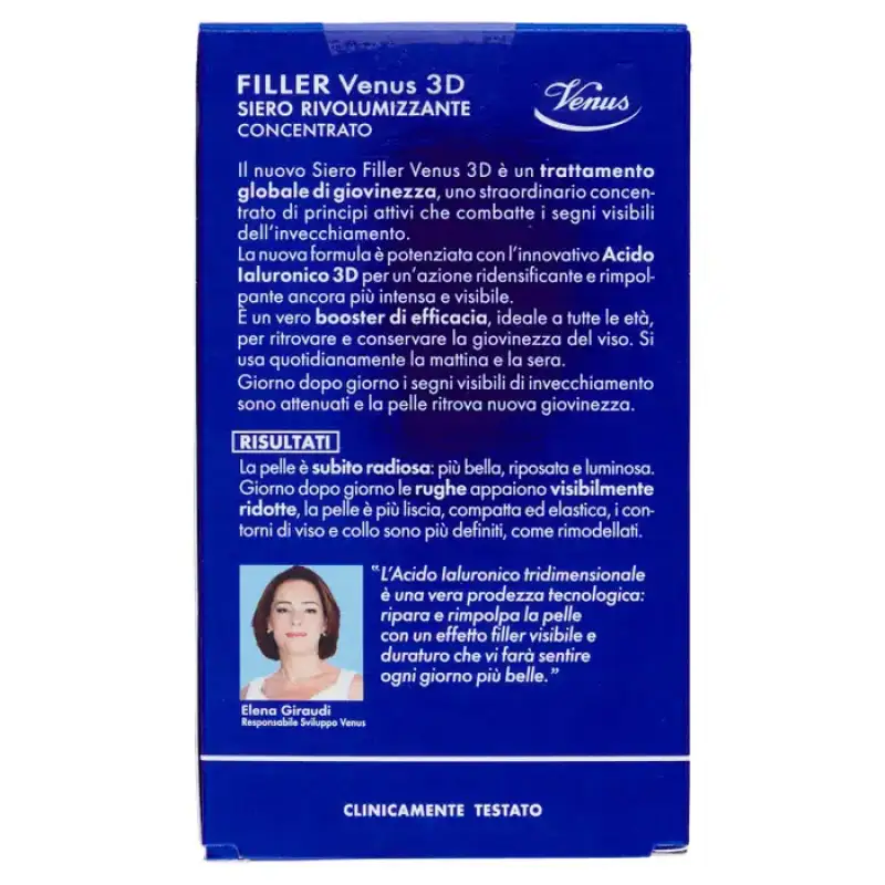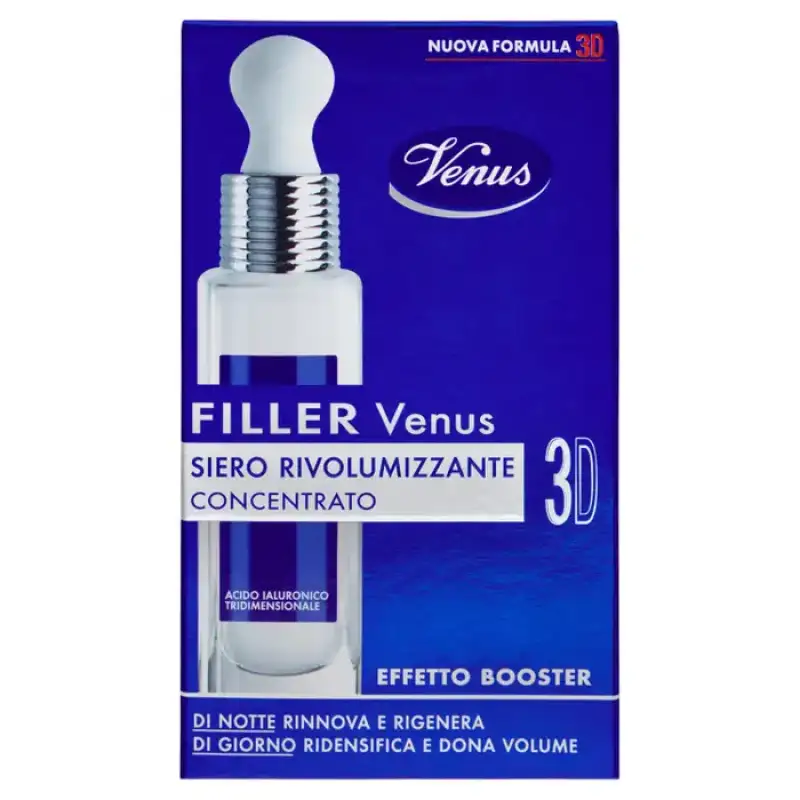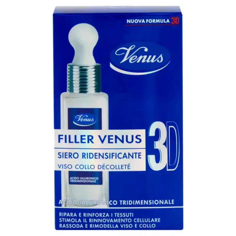 Noul Venus 3D Filler Serum este un tratament global pentru tineret, un concentrat extraordinar de ingrediente active care combate semnele vizibile ale imbatranirii. Noua formulă exclusivă este îmbogățită cu acidul hialuronic inovator 3D pentru o acțiune de redensificare și de redensificare și mai intensă și mai vizibilă. Este un adevărat booster de eficacitate, ideal pentru toate vârstele, pentru a redescoperi și menține tinerețea feței. Se folosește zilnic dimineața și seara. Zi de zi, semnele vizibile ale îmbătrânirii sunt atenuate, iar pielea își recapătă o nouă tinerețe. Rezultate Pielea este imediat strălucitoare: mai frumoasă, mai odihnită și mai luminoasă. Zi de zi, ridurile apar vizibil reduse, pielea este mai fina, mai compacta si elastica, conturul fetei si gatului sunt mai definite, parca remodelate. „Acidul hialuronic tridimensional este o adevărată ispravă tehnologică: repară și împrospătează pielea cu un efect de umplere vizibil și de lungă durată, care te va face să te simți mai frumoasă în fiecare zi.” Elena Giraudi Venus Development Manager Testat clinic Noaptea - Repara si regenereaza tesuturile, fermeaza si remodeleaza fata si gatul (Fito-Proteine) - Accelereaza procesul de reinnoire celulara nocturna (Venus Enzyme Complex) - Stimuleaza purificarea si detoxifierea pielii ( Escină și Cofeină) În timpul zilei - Reface volumele faciale și umple ridurile cu un efect de umplere intens (Acid Hialuronic 3D) - Garantează o hidratare perfectă și echilibrată pe tot parcursul zilei (Microinfuzii de Acid Hialuronic) - Asigură protecție antioxidantă intensă care neutralizează radicalii liberi (Tocoferol) ).