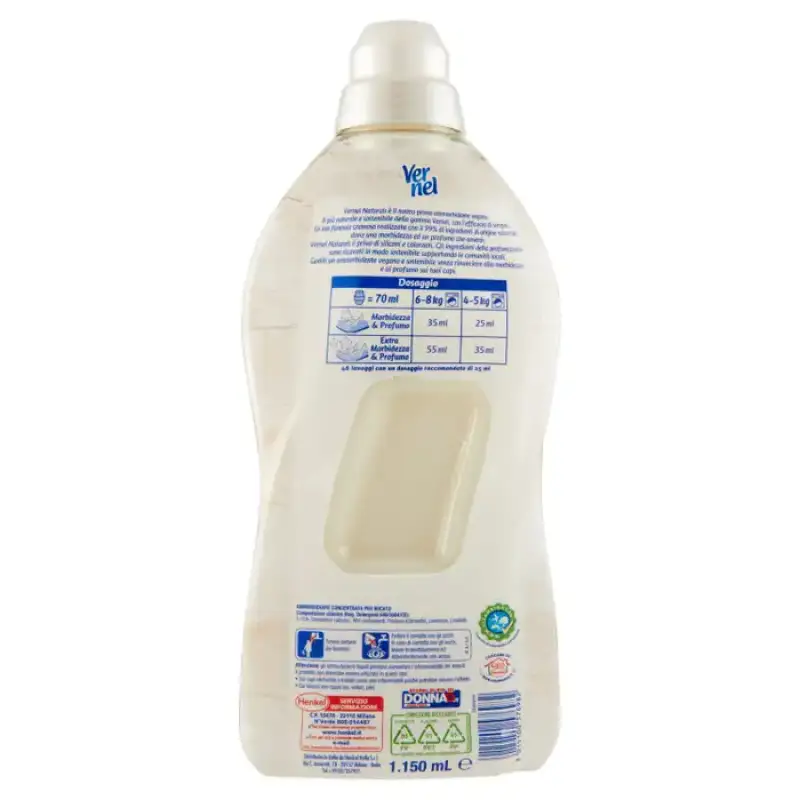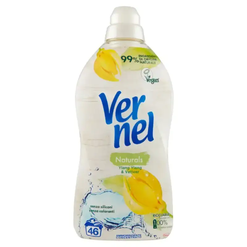 DESCRIERE: Vernel Concentrate Naturals Ylang Ylang & Vetiver 1.15L Vernel Naturals este primul nostru balsam vegan. Cel mai natural și durabil din gama Vernel, cu aceeași eficacitate ca întotdeauna. Formula sa cremoasa realizata cu 99% ingrediente de origine naturala, confera o catifelare si un miros pe care le vei iubi. Vernel Naturals nu conține siliconi și coloranți. Ingredientele parfumului sunt obținute în mod durabil prin sprijinirea comunităților locale. Bucurați-vă de un balsam vegan și durabil, fără a renunța la moliciunea și mirosul de pe haine. Fabrica noastra nu produce deseuri de la depozitul de deseuri.Eticheta si sticla separate pentru reciclare. INFORMATII PRODUS: Dozare Un capac = 70 ml Se spala la masina 6-8 kg | Moliciune și parfum: 35 ml | Extra moale și parfum: 55 ml Se spală la mașină 4-5 kg ​​| Moliciune și parfum: 25 ml | Extra Softness & Parfum: 35 ml 46 de spălări cu o doză recomandată de 25 ml. COMPOZIȚIE: Compoziție chimică (Reg. Detergenți 648/2004/EC):, 5-15% Agenți tensioactivi cationici, Alte componente: Parfum (Citronellol, Limonene, Linalool).