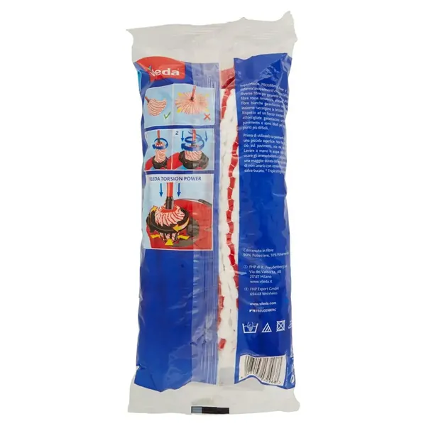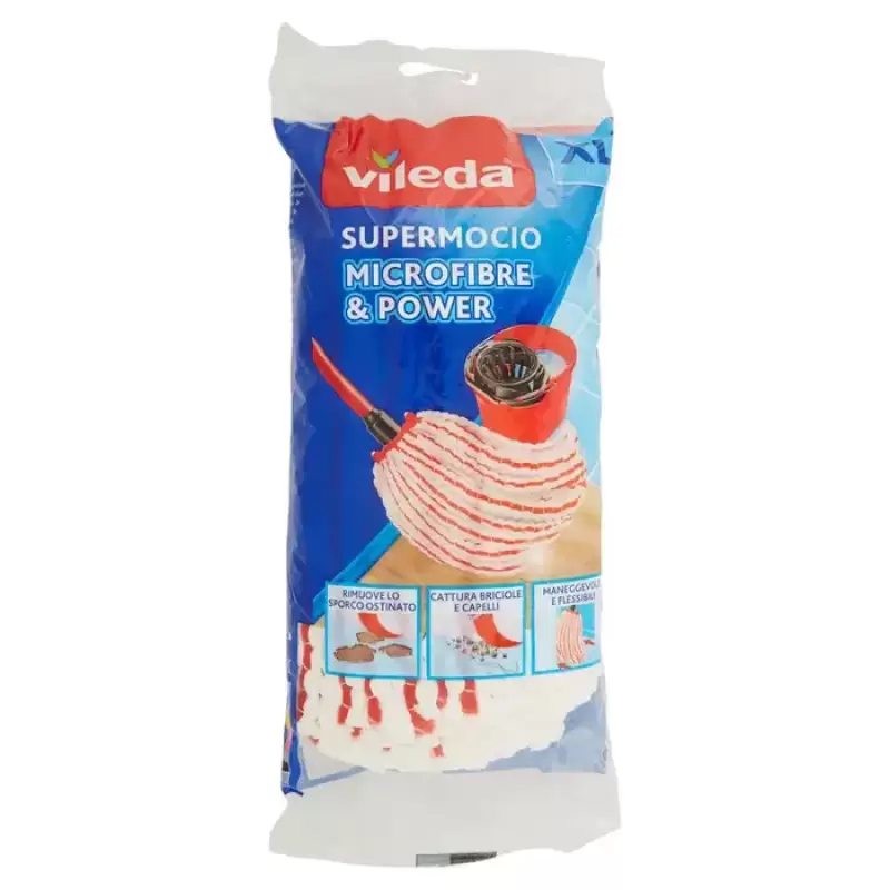 DESCRIERE: VILEDA Microfibră SuperMocio și putere pentru pete încăpățânate SuperMocio Microfibre & Power este sistemul inovator de curățare a podelei care combină eficiența a două fibre diferite pentru a asigura o curățare profundă: fibrele roșii îndepărtează eficient murdăria; fibrele albe garantează o absorbție excelentă; împreună adună firimiturile și cea mai fină murdărie. În comparație cu o capsă standard, franjurii flexibile răsucite garantează o aderență excelentă la podea și sunt ideale pentru a ajunge chiar și în cele mai dificile puncte.