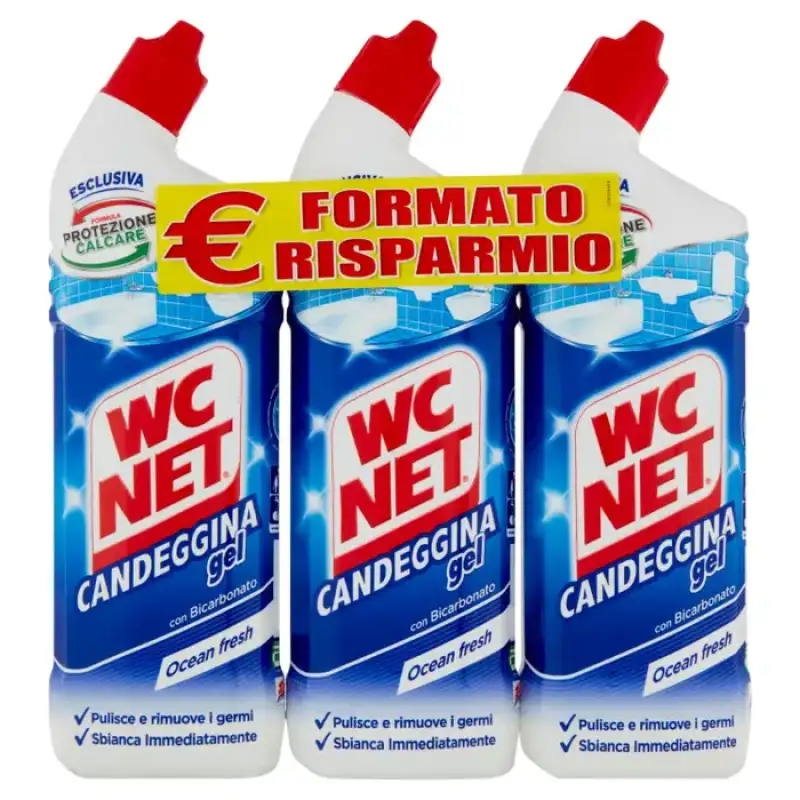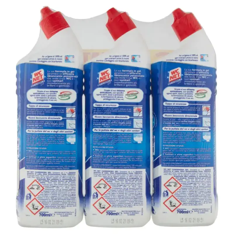 DESCRIERE: Wc Net Bleach Gel Ocean Fresh 3buc x 700ml Formula sa de gel garantează o eficiență sporită de albire, ceea ce face ca toaleta și corpurile sanitare să fie imediat mai luminoase și mai igienizate. Formula de protectie a calcarului Datorita sistemului sau anticalcar, cu agenti activi specifici, ajuta la prevenirea formarii calcarului, protejandu-ti toaleta. Noua duză direcțională Datorită gâtului său înclinat și noua duză direcțională, ajunge mai bine sub marginea toaletei și aderă de pereți pentru o mai mare eficacitate. Pentru curățarea toaletei și a altor corpuri sanitare Potrivit pentru curățarea nu numai a toaletei, ci și a altor corpuri și suprafețe sanitare: chiuvete, bideuri, căzi, dușuri, robinete, pardoseli ceramice, gresie și rosturi. Folosit în mod regulat previne formarea blocajelor în canalele de scurgere. Gel de înălbire WC Net. Curatator de toalete. Conține: hipoclorit de sodiu, oxid de alchil dimetilamină. PERICOL. Provoacă arsuri grave ale pielii și leziuni oculare grave. Poate fi coroziv pentru metale. Foarte toxic pentru organismele acvatice cu efecte de lungă durată. Atenţie! Nu utilizați în combinație cu alte produse. Se pot forma gaze periculoase (clorul). A nu se lăsa la îndemâna copiilor. Păstra sub cheie. Purtați mănuși și îmbrăcăminte de protecție. Protejați-vă ochii și fața. ÎN CAZ DE CONTACT CU PIELEA: Îndepărtați imediat toate hainele contaminate. Clătiți pielea. ÎN CAZ DE CONTACT CU OCHII: clătiți bine timp de câteva minute. Îndepărtați orice lentile de contact dacă este ușor să faceți acest lucru. Continuați clătirea. ÎN CAZ DE ÎNGHIȚIRE: clătiți gura. Nu provocați voma. Contactați imediat un CENTRU DE TOXICOLOGIE (0266101029) sau un medic. Dacă consultați un medic, aveți la dispoziție recipientul sau eticheta produsului. Aruncați produsul/recipientul în conformitate cu reglementările. Nu expuneți la lumina directă a soarelui sau la alte surse de căldură. A.I.S.E. www.cleanright.eu INFORMAȚII PRODUS: Capac de siguranță Pentru a deschide, apăsați pe punctele indicate pe părțile laterale ale capacului și deșurubați-l în sens invers acelor de ceasornic (vezi ilustrația alăturată). Instructiuni de utilizare: - WC: Pulverizati generos sub margine si pe peretii toaletei. Lăsați să acționeze cel puțin 30 de minute înainte de clătire. - Corpuri sanitare și alte suprafețe: Aplicați produsul direct pe suprafață, ștergeți cu un burete și clătiți bine cu apă. Pentru o murdărie mai încăpățânată, lăsați să acționeze câteva minute. COMPOZIȚIE: Ingrediente-648/2004/EC (www.boltondet.com):, <5% Albitori pe bază de clor, agenți tensioactivi neionici, săpun, parfumuri