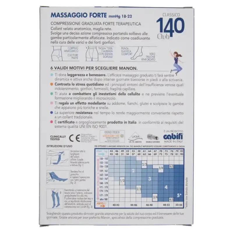Masaj mmHg 18-22 Compresie gradata terapeutica puternica Colanti anatomici transparenti, plasa plasa. Realizează o acțiune puternică de compresiune, aducând ușurare picioarelor deosebit de obosite. Indicat ca adjuvant în tratamentul varicelor și umflăturilor severe. Corset anatomic - Cusături plate Mărime * 5XXL calibrat - Cu bandă dorsală Deget elastic confortabil - Toc real * întărit suplimentar cu bandă dorsală 6 Motive bune pentru a alege Manon. - Iti ofera lejeritate si stare de bine. Masajul eficient gradat te va face sa te simti dinamic si activ chiar si dupa zile intense petrecute in picioare sau la birou. - Contrastează stresul zilnic și principalele simptome ale insuficienței venoase precum durere, umflături, furnicături, fragilitate capilară. - Te ajuta sa combati imperfectiunile celulitei si previne eventuala ei formare prin imbunatatirea microcirculatiei. - Iti ofera un efect de modelare asupra abdomenului, soldurilor, feselor si sculpteaza picioarele care par mai tonifiate si mai subtiri. - Rezistenta superioara in timp il face mai convenabil decat colantii traditionali. - Este certificat și produs cu mândrie în Italia în conformitate cu cerințele sistemului de calitate UNI EN ISO 9001. Este un produs cabifi Made in Italy Alegând acest produs, dați o mare atenție sănătății corpului dumneavoastră și bunăstării. din zilele tale. Vă mulțumim din nou pentru că ați ales-o pe Manon, specialist absolvent în compresie. Instrucțiuni de utilizare 1. Înfășurați chiloții pe toată lungimea, introduceți piciorul făcând să se lipească degetul și călcâiul (fig. 1) 2. Întindeți până la genunchi și repetați operația cu celălalt picior (fig. 2) 3 Exersând o extensie a țesăturii spre exterior, purtați treptat până la talie. Colantii trebuie sa fie bine intinsi si cu o distributie echilibrata a elasticitatii, evitand punctele de compresie incorecte (fig. 3.). Avertismente Spălați manual cu săpun neutru și lăsați să se usuce departe de surse de căldură