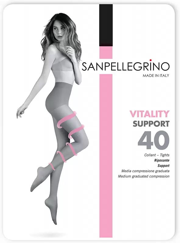 DESCRIERE: Sanpellegrino Vitality Support 40 denari Negru V Colanti transparenti de sustinere, cu o talie confortabila, inalta si moale, care asigura sustinere maxima in talie, dar nu se strange sau se ruleaza. Corsetul este ușor conturat, iar vârful este invizibil. INFORMAȚII PRODUS: Este de preferat spălarea mâinilor, pentru a păstra integritatea produsului. Alternativ, puteți efectua o spălare delicată în mașina de spălat, folosind pungile adecvate. COMPOZIȚIE: 87% POLIAMINĂ - 13% ELASTAN